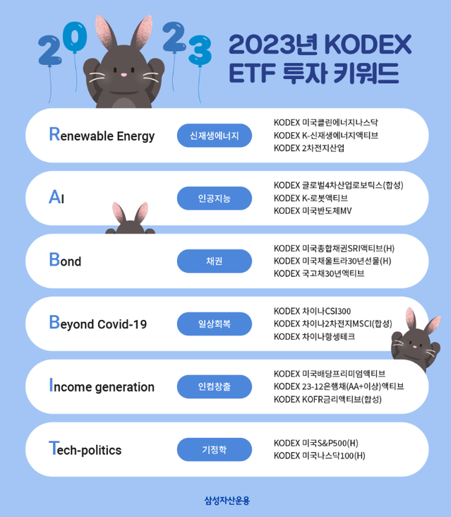 삼성자산운용은 2023년 계묘년을 맞아 투자자들이 주목해야 할 투자 키워드로 ‘R.A.B.B.I.T.(토끼)’를 선정했다고 9일 밝혔다.지속되는 고금리 상황과 경기 침체 등 어려운 시장 환경 속에서도 유망한 투자 키워드를 찾는 투자자라면 고려해볼 만하다.투자 키워드 ‘R.A.B.B.I.T’은 총 여섯 개의 투자분야로, 각각 ‘신재생에너지(Renewable Energy)’, ‘인공지능(AI)’, ‘채권(Bond)’, ‘일상회복(중국)(Beyond Covid-19)’, ‘인컴창출(Income generation)’, ‘기정학(Tech-politics)’을 의미한다.먼저 신재생에너지는 2차전지, 태양광, 풍력, 기타 탄소저감 등과 관련된 분야다. 기후변화로 인한 폭염, 한파 등이 전세계적으로 발생하고 있고 지정학적 리스크로 인한 에너지 안보 또한 지속되고 있는 만큼 기후 위기에 대응해야 한다는 전세계의 공감대가 커지면서 파리기후협약(UN), Fit for 55(EU) 등 각국이 적극적으로 정책을 시행 중이다.특히 러·우 전쟁 이후 화석연료 의존도를 낮추기 위한 움직임이 가속화되면서 신재생에너지 분야에 대한 관심과 투자가 확대될 전망이다. 관련 ETF로는 ▲KODEX 미국클린에너지나스닥 ▲KODEX K-신재생에너지액티브 ▲KODEX 2차전지산업 ETF 등이 있다.인공지능 또한 신년 주목해야 할 투자 분야다. 인구 고령화와 출산율 감소로 노동력 부족 현상에 직면함에 따라 무인화 및 자동화로의 전환은 불가피한 트렌드가 됐다. 이미 빠르게 자동화 되고 있는 산업 현장뿐 아니라 서비스 현장에서도 AI, 로봇으로 해결하기 위한 움직임이 나타나고 있다.특히 팬데믹 이후 제조업 현장에서 디지털 경제 전환이 가속화되고 있다. ▲KODEX 글로벌4차산업로보틱스(합성) ▲KODEX K-로봇액티브 ▲KODEX 미국반도체MV ETF 등을 활용할 만하다.다음은 채권이다. 채권은 이례적으로 금리가 가파르게 상승했던 작년 한 해 동안 큰 투자 트렌드로 부상했다. 경기 침체 우려에도 인플레이션을 잡기 위한 미 연준의 통화정책은 2023년 상반기까지 유지될 것으로 전망되며, 하반기로 갈수록 경기둔화 우려에 따른 금리 인하 가능성이 올라갈 것으로 보인다.채권 투자, 특히 중장기 채권에 투자한다면 고금리(이자) 투자 매력과 하반기 이후 채권가격 상승으로 인한 자본 이득까지 기대할 수 있다. 삼성자산운용의 채권형 ETF 중에서는 중장기 듀레이션의 ▲KODEX 미국종합채권SRI액티브(H) ▲미국채울트라30년선물(H) ▲KODEX 국고채30년액티브 ETF 등을 주목할 만하다.일상회복 또한 2023년 주요한 투자 포인트다. 새로운 변이 바이러스의 발생 우려가 높지만 중국 내 코로나 확산세는 빠르게 정점에 도달할 것으로 전망하고 있다. 이후 중국의 전면적인 일상회복(리오프닝) 재개 상황이 오면 중국 정부 주도의 투자 확대 및 민간기업 투자 장려로 인한 중국 내수 활성화가 기대된다. 관련 ETF로는 ▲KODEX 차이나CSI300 ▲KODEX 차이나2차전지MSCI (합성) ▲KODEX 차이나항셍테크 ETF 등이 있다.인컴창출형 투자상품을 주목할 만하다. 인플레이션과 고금리 시기라는 점을 감안하면 투자의 관점에서 인컴 자산에 대한 매력이 높아질 것으로 보인다. 배당은 기업의 본질가치(펀더멘탈)을 가늠할 수 있는 역할을 하는 만큼, 꾸준히 배당을 지속하거나 확대하는 기업에 대한 관심을 가질 필요가 있다.또한 금리 변동에 따른 리스크를 배제하면서 상대적으로 높아진 이자 소득을 수취하는 만기매칭형 채권 또는 무위험지표금리(KOFR)에 대한 관심도 지속될 것으로 보인다. 관련 ETF로는 ▲KODEX 미국배당프리미엄액티브 ▲KODEX 23-12 은행채 액티브 ▲KODEX KOFR 금리 액티브 ETF 등이 있다.마지막으로 올해는 미국과 중국의 무역분쟁에서 촉발된 국가 및 지역간 기술 패권이 국제 정치를 좌우하는 기정학 시대가 본격화될 것으로 예상된다. 이는 더이상 지정학(geopolitics) 중심이 아닌 전략 기술이 국가간 안보, 외교에 큰 영향을 미치게 될 것이라는 점을 시사한다.지속적으로 성장 가능한 정치·제도적 이점과 거대 내수시장을 바탕으로 한 미국 기업들의 기술적 우위가 유지될 전망이며, 미국 경제 성장과 기술산업에 대한 관심은 2023년에도 여전히 유효할 전망이다. 다만, 강달러 현상은 완화될 것이라는 전망이 많은 만큼 환헤지형 상품인 ▲KODEX 미국S&P500(H) ▲KODEX 미국나스닥100(H)에 관심을 가질 만하다.김도형 ETF컨설팅팀장은 “글로벌 경제 상황과 투자 환경 등을 살펴 2023년 계묘년에 투자하기 좋은 ETF 키워드로 ‘토끼(R.A.B.B.I.T.)’를 선정했다”며 “올해 증시는 특히 국가(지역)·자산·섹터별 차별화가 두드러질 것으로 전망되며, 포트폴리오 자산배분과 위험관리에 따라 수익률 또한 달라질 것”이라고 전했다.