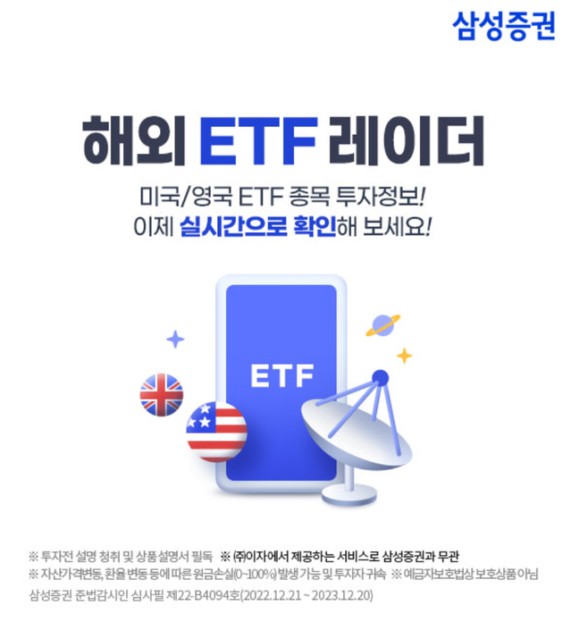 삼성증권은 해외ETF 정보를 실시간으로 제공하는 '해외 ETF 레이더' 서비스를 론칭한다고 12일 밝혔다.이 서비스는 개인투자자의 투자가 늘어나는 글로벌 ETF의 시세와 급등락 등의 순위 정보를 실시간으로 제공하는 서비스로, 개인투자자들이 해외ETF 시장의 흐름을 한눈에 파악하는 데 효율적으로 활용할 수 있다.레버리지·인버스·월배당 등 투자자들이 많이 투자하는 ETF에 대한 투자전략을 제공하고, ETF의 테마·섹터 등을 인기순으로 한 눈에 볼 수 있는 카테고리 정렬 기능 역시 제공하고 있다.특정 종목을 검색하면 해당 종목이 편입된 ETF를 편입 비중 순으로도 조회가 가능하다. '테슬라'를 검색창에 넣으면 테슬라가 편입된 TSLQ, TSLH, TSL, TSLI 등 테슬라가 포함된 ETF를 확인할 수 있다.3000개가 넘는 해외 ETF를 전략, 섹터,운용사 등 카테고리별로 한눈에 볼 수 있게 제공하고 있어 ETF 투자자들의 고민이었던 종목정보 확인이 가능해 투자자들의 편의성을 높였다.현재 미국과 영국의 ETF 정보가 제공 중으로, 대상 국가를 점차 확대해나갈 계획이다. 'AI운용' 관련 카테고리를 선택하면 관련 ETF들을 가격변화율, 일평균 거래량, 시가총액, 운용보수에 대해 기간별로 데이터를 확인할 수 있다.이번 서비스는 삼성금융 오픈컬래버레이션을 통해 선정된 이자(eZar)와의 제휴를 통해 업계 최초로 시도하는 것으로 미국 NYSE, 레피니티브 등과 데이터 협업을 통해 개발됐다.회사 관계자는 "글로벌 증시 변동성이 확대됨에 따라, 지수를 추종하는 ETF 상품, 혹은 경기 상황에 따른 특정 테마를 추종하는 ETF 등에 대한 투자자들의 관심이 높아지고 있다"며 "해외 ETF 레이더 서비스 제휴를 통해 투자자들이 새해 전략을 세우는데 도움이 되길 바란다"고 밝혔다.한편 회사는 오는 2월 10일까지 국내외 ETF·ETN(상장지수펀드·상장지수증권)을 첫 거래한 고객을 대상으로 이벤트를 진행한다.