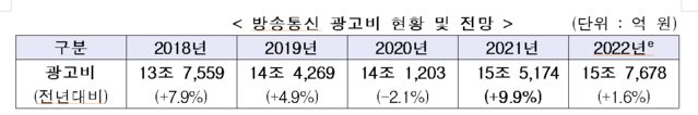 과기정통부, 2021년 방송통신 광고비 조사 결과 발표 방송 4조 531억원, 온라인 8조 36억원 집계코로나19·도쿄 올림픽 특수 힘입어... 2022년 성장률 둔화 전망