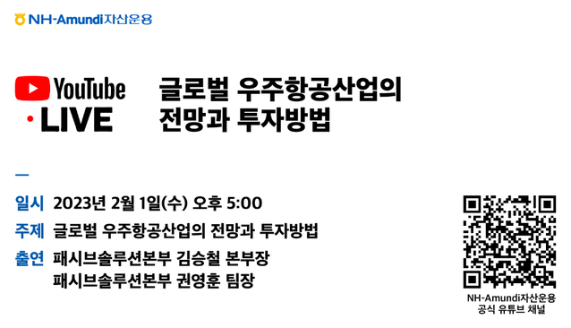 NH아문디자산운용은 오는 1일 오후 5시부터 공식 유튜브 채널을 통해 ‘글로벌 우주항공 산업의 전망과 투자방법’을 주제로 무료 웹세미나를 진행한다고 30일 밝혔다.이번 웹세미나는 글로벌 우주항공 펀드를 운용하고 있는 김승철 패시브솔루션본부장과 권영훈 팀장이 직접 나선다.차세대 메가트렌드로 꼽히는 우주항공산업의 글로벌 전망에 대해 자세히 소개한다. 우주항공산업의 투자 방법과 더불어 이 회사 글로벌 우주항공 펀드 소개도 진행될 계획이다.웹세미나가 진행되는 동안 댓글을 통해 실시간 질의응답도 가능하다.행사는 회사 홈페이지의 공지사항에서 사전 참여 신청이 가능하다.사전 참여 신청자 중 추첨을 통해 100명에게 스타벅스 아메리카노 쿠폰을 증정하는 이벤트도 진행하고 있다. 또한 웹세미나에서 실시간 퀴즈 이벤트 참여 시 추첨을 통해 BBQ 황금올리브 쿠폰을 증정한다.김광주 마케팅총괄부사장은 "투자자들의 관심이 트렌드 변화에 민감하게 반응하는 만큼 차세대 메가트렌드로 꼽히는 주제를 통해 투자 아이디어를 제공하고자 했다"며 "실시간 소통을 통해 투자자들의 궁금증을 적극 해결하면서 고객 만족도를 높일 계획"이라고 전했다.