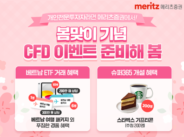 메리츠증권은 차액결제거래(CFD) 고객들을 대상으로 슈퍼365 계좌 개설 이벤트를 오는 4월 30일까지 진행한다고 7일 밝혔다.CFD 계좌 보유고객이 슈퍼365 계좌를개설하고 4월 30일까지 잔고 100만원 이상을 유지하면 최대 200명에게 추첨을 통해 스타벅스 기프티콘을 지급한다.