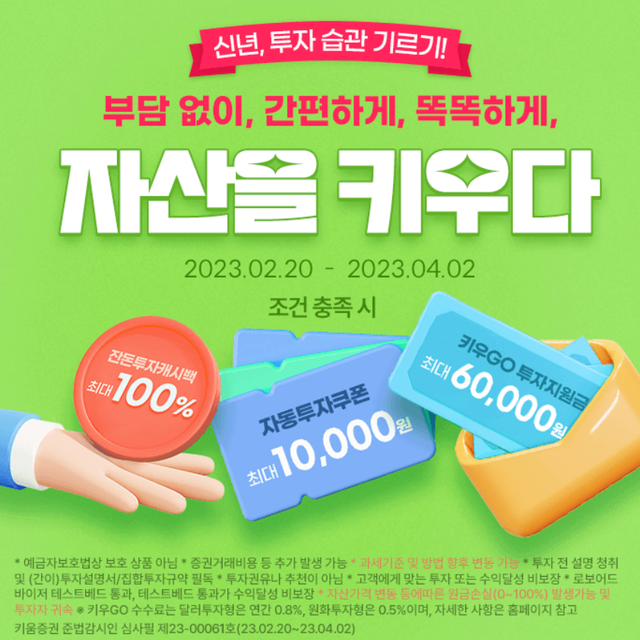 키움증권은 잔돈투자·자동투자 및 키우GO 서비스를 이용하는 고객 대상 이벤트를 4월초까지 진행한다고 24일 밝혔다.잔돈투자 서비스는 100원 이상 1000원 미만의 소액을 매주 정해진 요일에 자동으로 지정한 펀드에 투자하는 서비스다. 투자를 처음 시작하는 2030세대, 고액의 투자는 부담스러운 고객, 계좌에 남아있는 잔돈을 활용하고 싶은 고객까지 부담 없이 소액으로 펀드 투자가 가능하다.이 서비스를 이벤트 기간 내 가입하는 신규 및 기존 고객 전원은 투자금액의 10%를 캐시백 받을 수 있으며, 10명은 추첨으로 100% 캐시백을 지급한다.이와 함께 자동투자 서비스를 처음 이용하는 고객에게 현금 쿠폰을 지급하는 이벤트도 진행한다. 기존 자동투자 경험이 있는 고객은 잔돈투자 가입 조건으로 자동투자 5000원 쿠폰을 받을 수 있다. 자동투자 신규 고객이 잔돈투자 가입까지 완료하면 최대 1만원 쿠폰 받기가 가능하다.로보어드바이저 키우GO 서비스를 가입하는 고객 대상으로 투자 지원금도 최대 6만원 지급한다.회사 관계자는 “투자에 대한 관심이 젋은층으로 확산되면서 적은 금액으로 투자가 가능한 잔돈투자 및 자동투자와 인공지능(AI) 기반 로보어드바이저 서비스인 키우GO에 대한 관심도 지속적으로 늘고 있다”며 “이번 기회에 투자 경험과 이벤트 혜택을 동시에 누리길 바란다”고 말했다.