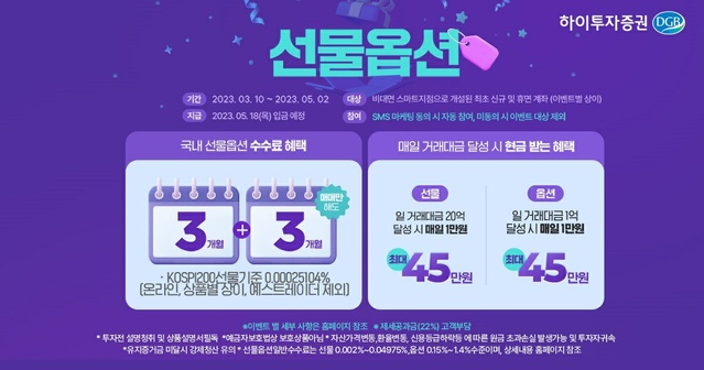 하이투자증권은 오는 5월 2일까지 비대면 고객을 대상으로 선물옵션 거래 이벤트를 진행한다고 13일 밝혔다.먼저 이벤트 기간 내 비대면 최초 신규 계좌를 개설한 고객과 휴면 고객에게 국내 선물옵션 온라인 매매수수료를 3개월간 우대혜택을 제공한다. 단 한 번이라도 매매 실적이 있는 경우에는 최대 6개월까지 연장해 혜택을 적용받을 수 있다.수수료 우대혜택을 받는 투자자는 이벤트 기간 동안 선물옵션 매매시 유관기관 수수료만 납부하게 되며, 시스템트레이딩 제휴 서비스인 예스트레이더를 통한 거래에는 적용되지 않는다.비대면 계좌를 보유한 모든 고객을 대상으로 선물옵션 매매 현금 리워드 혜택도 제공한다.일간 선물매매 금액 20억원 이상을 달성하는 경우 1만원씩 적립해 최대 37만원의 현금을 지급한다.옵션매매 금액 1억원 이상 달성할 때도 1만원씩을 적립해 최대 37만원을, 선물옵션 각각의 거래대금 조건을 7일 이상 충족할 때는 각 8만원씩의 현금을 추가로 지급한다.