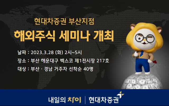 현대차증권 부산지점은 오는 28일 부산 해운대구 벡스코에서 부산·경남 거주 투자자를 대상으로 해외주식 관련 세미나를 개최한다고 20일 밝혔다.이번 세미나는 해운대구 벡스코 제1전시장 217호에서 오후 2시부터 5시까지 3시간 동안 진행된다. 해외주식에 관심 있는 부산·경남 투자자 40명을 선착순으로 모집하며, 접수는 부산지점으로 접수 가능하다.세미나는 ▲현대차증권 해외주식 서비스 주요 소개 ▲미국증시 유망테마 및 종목(정나영 애널리스트 초청) ▲중국증시 투자전략 및 종목(여태경 애널리스트 초청)으로 구성된다.특히 미국주식 유망 테마의 경우 최근 투자자들 사이에서 관심이 높은 ‘반도체 지원법’, ‘인플레이션 감축법(IRA)’, ‘인공지능(ChatGPT)’ 등을 소개할 예정이다. 중국 양회 이후 더욱 주목 되고 있는 중국 주식 투자에 대해서는 ‘지금 중국 주식을 봐야하는 이유’, ‘중국 증시 주요 대내외 이슈 점검’ 등이 이뤄질 예정이다.박문식 남부권역장 상무는 “이번 세미나를 통해 지역 사회 고객 분들의 해외주식 투자에 많은 도움이 되기를 바란다”며 “앞으로도 고객과의 접점을 다양화할 수 있도록 노력하겠다”고 전했다.