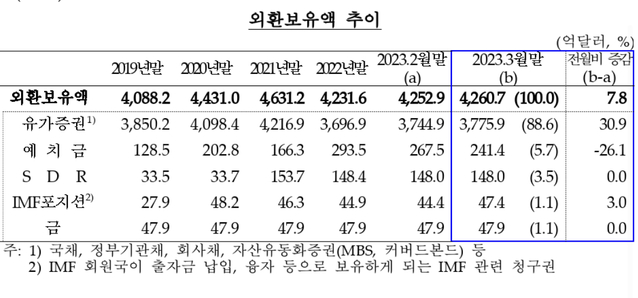 지난달 미국 달러 약세가 이어지며 외환보유액이 한 달 만에 반등해 4260억7000만달러로 집계됐다.한국은행이 5일 발표한 3월 말 기준 외환보유액은 전월 보다 7억8000만달러 증가한 규모다.외환보유액은 지난해 11월부터 올해 1월까지 3개월 연속 늘다가 2월 원/달러 환율이 오르며 감소하다 한 달 만에 반등에 성공했다.이번 외환보유고 증가는 유로 등 기타통화 외화자산의 미국 달러 환산액이 증가한 데 따른 결과다.지난달 달러가 약세를 보이며 외환시장 변동성 완화를 위한 달러 매도 개입에 나서지 않은 점도 영향을 준 것으로 풀이된다.지난달 미국 달러화가 약 2.4%(미국 달러화 지수 기준) 평가 절하해 미국 달러로 환산한 기타 통화 외화자산이 늘었다.외환보유액을 자산별로 살펴보면 국채·회사채 등 유가증권이 3775억9000만 달러로 한 달 전보다 30억9000만달러 확대됐다.IMF(국제통화기금)의 특별인출권인 'IMF 포지션'은 47억4000만달러로 전월대비 3억달러 늘었다.예치금은 26억1000만 달러 감소한 241억4000만 달러로 집계됐다. 감소폭은 전달(74억2000만 달러) 보다 축소됐다. 금은 47억9000만 달러로 전월과 같았다.한국의 외환보유액 규모는 2월 말 기준(4253억달러)으로 세계 9위 수준이다.중국이 3조1332억달러로 가장 많았고 이어 일본(1조2260억달러)과 스위스(8982억달러), 러시아(5742억달러), 인도(5627억달러), 대만(5584억달러), 사우디아라비아(4523억달러), 홍콩(4291억달러) 순으로 집계됐다.
