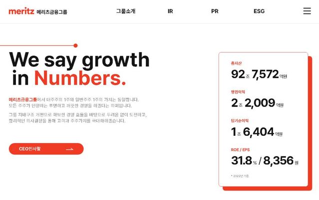 메리츠금융지주는 메리츠화재와 메리츠증권을 완전 자회사로 편입하며 단일 상장사로서 그룹의 ‘원 메리츠(One Meritz)’를 완성하기 위한 홈페이지를 25일 새롭게 선보였다고 밝혔다.홈페이지 리뉴얼을 통해 주주·고객 소통과 ESG 경영을 위한 길잡이로서 홈페이지 역할을 강화할 계획이다.대대적으로 개편된 그룹 홈페이지는 메리츠만의 스타일로 불필요한 정보들을 모두 걷어내고 숫자와 간결한 정보에 집중했다. 보여주기식 소개 글과 복잡한 디자인적 요소는 최대한 덜어내 홈페이지를 방문하는 주주와 고객 관점에서 정보 습득 편의성을 최적화했다.효과적인 정보 전달을 위해 홈페이지 디자인에도 변화를 줬다. 메리츠의 CI 색상인 ‘오렌지 레드’를 활용해 기업 아이덴티티가 강조되는 수치 및 시각 자료를 배치했다.첫 메인 화면에서는 '숫자로 성장을 보여주겠다(We say growth in Numbers)'는 문구와 함께 지주 실적 수치를 한눈에 파악할 수 있도록 구성했다. 대주주 1주와 일반주주 1주의 가치는 동일하다는 그룹의 원칙에 따라 모든 주주가 인정하는 투명하고 깨끗한 경영을 하겠다는 의미이다.뿐만 아니라 경영활동에 관련된 모든 정보와 계열사 실적 수치, 배당금과 배당총액, 자사주 매입·소각 금액, 주주환원율도 일목요연하게 구성해 빠른 이해를 돕고 모바일에서도 핵심 내용을 직관적으로 파악할 수 있도록 했다.리뉴얼된 웹사이트에는 ESG 파트를 신설해 환경·사회·책임 경영 전략과 사회공헌 프로그램 등 다양한 정보와 더불어 ESG 연간 보고서도 지속적으로 제공해 사회적 가치를 창출하는 그룹에 대한 고객의 신뢰를 강화할 예정이다.김용범 대표이사 부회장은 “메리츠금융지주와 그룹의 핵심 계열사인 메리츠화재, 메리츠증권은 안정적인 수익성을 바탕으로 한 효율적인 자본 배분을 통해 이전보다 유기적인 재무 유연성을 발휘할 수 있게 됐다”며 “앞으로 시너지와 전문성을 제고하고, 시장 안정화에 기여하기 위해 금융 생태계를 확장해나갈 예정이다”고 말했다.