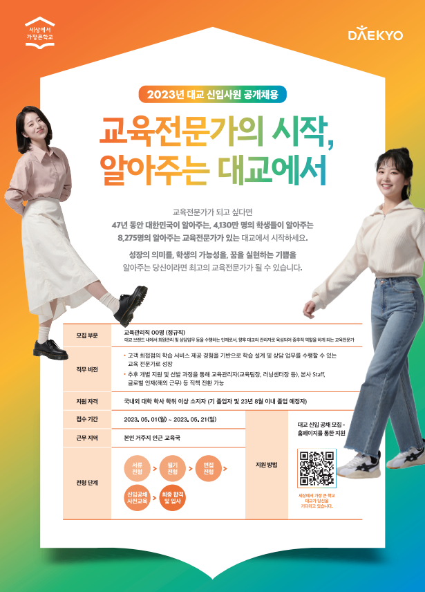 대교가 오는 21일까지 '2023년 신입사원 공개채용'에 나선다고 8일 밝혔다.이번 신입 공채의 모집 대상은 4년제 대학 졸업예정자와 졸업자로, 전공에 제한 없이 지원할 수 있다. 서류전형과 필기시험, 면접 등을 거친 응시자는 사전교육을 받고 오는 7월 정규직 신입사원으로 선발된다.대교는 회사의 비전을 공유하는 입문교육과 실제 교육 현장에서 실무를 경험하는 현장실습 프로그램을 신입사원 사전 교육과정으로 진행한다. 채용 후 개별 지원과 선발과정을 통해 교육팀장, 눈높이러닝센터장 등 교육관리자, 본사 스태프, 해외 근무 등 직책 전환도 가능하다.대교 관계자는 "이번 신입사원 공채는 대교의 인재상과 조직 문화 적합성에 부합하는 인재를 선발하기 위해 이 부분을 중점적으로 평가할 예정"이라며 "지혜롭고 미래 가능성이 무궁무진한 인재들의 많은 지원 바란다"고 말했다.