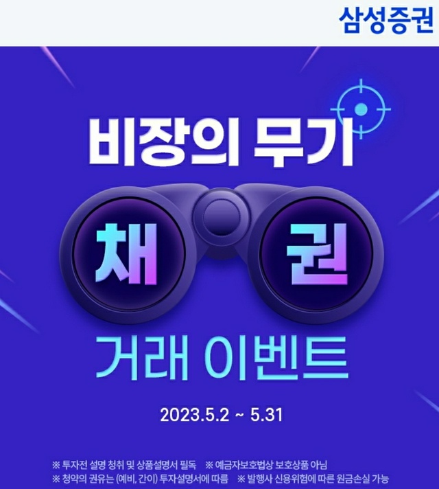삼성증권은 모바일 앱 엠팝(mPOP)에서 해외 채권을 1000달러 이상 순매수한 고객을 대상으로 커피 기프티콘 등의 상품을 제공하는 '비장의 무기 채권거래' 이벤트를 5월 31일까지 진행한다고 9일 밝혔다.이벤트는 총 세 가지 이벤트로 진행된다. 우선 이벤트 기간 내에 삼성증권 모바일 앱에서 이벤트를 신청하고, 기간내 엠팝으로 1000달러 이상 해외채권을 순매수 시 커피 기프티콘을 증정한다.이벤트 기간 내 삼성증권에서 국내외 채권 거래(매수·매도, 신탁계좌 거래 포함)가 한 번도 없었던 고객을 대상으로 삼성증권 온라인 채널을 통해 국내 장외채권을 100만원 이상 첫 거래한 고객 전원에게 1만원 상당의 리워드를 제공한다.이벤트 기간 동안 온라인 채널을 통해 국내 장외채권을 순매수한 금액별(누적)로 최대 20만원 상당의 리워드를 제공한다.세 가지 이벤트 모두 5월말까지 채권 잔고를 유지한 고객에게만 이벤트 경품이 제공된다.이벤트는 모바일 앱 엠팝뿐만 아니라 삼성금융네트웍스의 통합 앱 모니모를 통해서도 참여 가능하다. 최소 1000원부터 국채 및 다양한 채권에 투자할 수 있다.