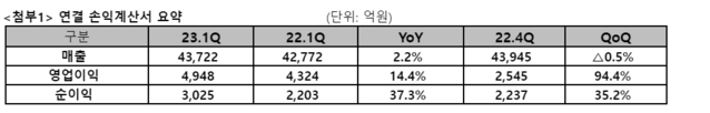 SK텔레콤은 2023년 1분기 매출 4조 3722억원, 영업이익 4948억원, 순이익 3025억원을 기록했다고 10일 밝혔다.전년 동기 대비 매출과 영업이익은 각각 2.2%, 14.4% 증가했다. 미디어와 엔터프라이즈 등 신사업 영역의 매출이 각각 10.2%, 5.8% 늘었다. 순이익은 투자회사 배당수익 확대 등에 따라 전년 동기 대비 37.3% 증가했다.SK브로드밴드(SKB)는 전년 동기 대비 3.5% 증가한 매출 1조 615억원을 기록했다. 영업이익은 761억원으로 전년 동기 대비 0.1% 증가했다. 데이터센터의 가동률 상승이 매출 성장을 견인했다.미디어 사업은 매출액 3932억원을 기록해 전년 동기 대비 10% 이상 증가하며 큰 폭으로 성장했다. 견고한 유무선 리더십을 기반으로 콘텐츠, 광고, 커머스 등 미디어 사업 전반이 양적 성장을 거뒀다. 향후 AI 기술을 활용해 미디어 사업의 경쟁력을 지속 강화할 예정이다.데이터센터와 클라우드를 중심으로 한 엔터프라이즈 사업 매출도 전년 동기 대비 5.8% 증가한 3862억원을 기록했다. 데이터센터와 클라우드의 매출은 전년 대비 각각 28.2%, 22.3% 증가하며 빠른 성장세를 이어가고 있다. 특히 이번 1분기에는 지난해 사업을 시작한 AICC(AI Contact Center) 분야에서 최대 규모 수주를 달성했다. 향후 AI 기술과 솔루션을 활용한 산업 전반의 AI 전환을 주도해 추가 성장을 도모할 계획이다.또한 구독 서비스 ‘T우주’는 1분기 월간 실사용자 180만 이상을 달성하며 국내 대표 구독 서비스로 입지를 공고히 하고 있다. 지난해 49개국에 출시한 글로벌 메타버스 플랫폼 ‘이프랜드’도 1분기 월간 실사용자 수의 10% 이상을 해외에서 유치하는 등 성과를 거뒀다. 5월 중 개인화 공간 ‘이프홈’을 출시했고 하반기 중 인앱 결제 기반의 콘텐츠 마켓 등 경제 시스템을 강화해 성장에 박차를 가할 계획이다.유무선통신 사업도 지속 성장 중이다. 1분기 말 기준 5G 가입자 수는 1415만명으로 전체 고객의 60%를 상회하고 있다. SK텔레콤은 지난 3월 고객의 다양한 이용 패턴과 연령대 특성을 고려한 5G 요금제 개편을 선제적으로 발표하며 고객의 선택권 확대에 앞장서고 있다. 지난 5월 초 '5G 맞춤형 요금제'와 3월 말 '5G 시니어 요금제'를 출시했으며, 오는 6월 데이터 제공량을 확대하고 청년 특화 혜택을 추가한 '0청년 요금제'도 출시할 예정이다.유선시장에서도 IPTV 및 초고속 인터넷 순증 1위를 달성하며 가입자 성장을 지속하고 있다. 1분기 말 기준 유료방송 가입자 수는 940만명, 초고속 인터넷 가입자 수는 676만명을 기록했다.SK텔레콤은 올해 AI 컴퍼니로의 전환과 도약을 전격 추진한다. 다년간 축적한 AI 서비스와 기술 역량을 활용해 고객·기술, 시공간, 산업(AIX), Core BM, ESG 등 5대 영역을 중심으로 혁신을 선도하는 ‘AI to Everywhere(AI를 모든 곳에)’ 전략을 펼친다.지난 4월에는 AI 에이전트 '이루다'를 보유한 스캐터랩에 150억원 규모의 지분투자를 진행하고 전략적 파트너십을 체결했다. 양사는 에이닷이 보다 친밀한 대화를 통해 고민이나 외로움을 해소하는데 도움을 주는 서비스로의 진화와 감성과 지식 영역을 모두 보유한 초거대 언어 모델(LLM, Large Language Model) 개발 등 AI 관련 다양한 영역에서 긴밀한 협력을 추진한다.이와 함께 SK텔레콤은 글로벌 톱 수준의 AI 기업들과 초거대 언어 모델 및 AI 기술, 서비스 등 분야에서 협력을 지속 강화해 AI 컴퍼니 도약에 박차를 가할 계획이다.김진원 SK텔레콤 CFO(최고 재무 책임자)는 "주요 사업 영역의 고른 성장을 바탕으로 한 AI 컴퍼니로의 도약과 전환이 기업과 주주가치 극대화로 이어질 수 있도록 최선을 다하겠다"고 밝혔다.