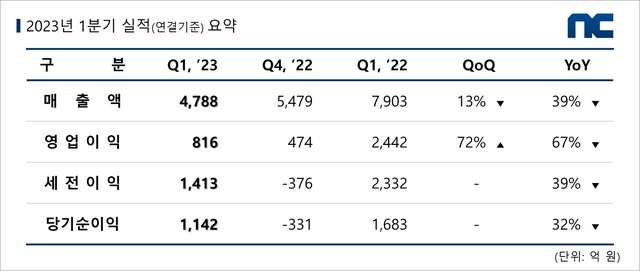 엔씨소프트가 1분기 주력 게임 흥행 부진으로 저조한 성적표를 받았다.엔씨는 2023년 1분기 매출 4788억원, 영업이익 816억원, 당기순이익 1142억원을 기록했다고 10일 밝혔다.매출은 전분기와 전년 동기 대비 각각 13%, 39% 감소했다. 영업이익은 전분기 대비 72% 증가, 전년 동기 대비 67% 줄었다. 당기순이익은 전분기 대비 흑자 전환, 전년 동기 대비로는 32% 감소했다.지역별 매출은 한국 3037억원, 아시아 994억원, 북미·유럽 333억원을 기록했다. 로열티 매출은 423억원이다. ‘길드워2’는 2014년 중국 출시(현지 서비스명: 격전2) 이후 최대 분기 실적을 기록하며 로열티 매출의 전분기 대비 9% 상승을 견인했다. 해외 및 로열티 매출은 전체 매출의 37%를 차지했다.모바일 게임 매출은 3308억원이다. 제품별로 살펴보면 ‘리니지M’ 1301억원, ‘리니지W’ 1226억원, ‘리니지2M’ 731억원, ‘블레이드 & 소울 2’는 50억원이다. 출시 7년차인 ‘리니지M’의 매출은 견조한 이용자 지표를 유지하며 전분기 대비 15% 성장했다.PC온라인 게임 매출은 914억원이다. ‘리니지’ 245억원, ‘리니지2’ 215억원, ‘아이온’ 176억원, ‘블레이드 & 소울’ 73억원, ‘길드워2’ 204억원이다.‘리니지M’, ‘리니지W’ 등 주요 모바일 타이틀은 2분기부터 순차적으로 대규모 업데이트를 진행한다. 글로벌 시장에서 완성도 높은 콘텐츠와 이용자 친화적인 서비스를 지속적으로 선보일 계획이다.엔씨는 올해 출시할 PC·콘솔 신작 ‘THRONE AND LIBERTY(쓰론 앤 리버티)’의 베타 테스트를 5월 24일부터 30일까지 진행한다. 글로벌 퍼블리싱 파트너사인 아마존게임즈와 글로벌 출시를 위한 협력을 진행 중이다.
