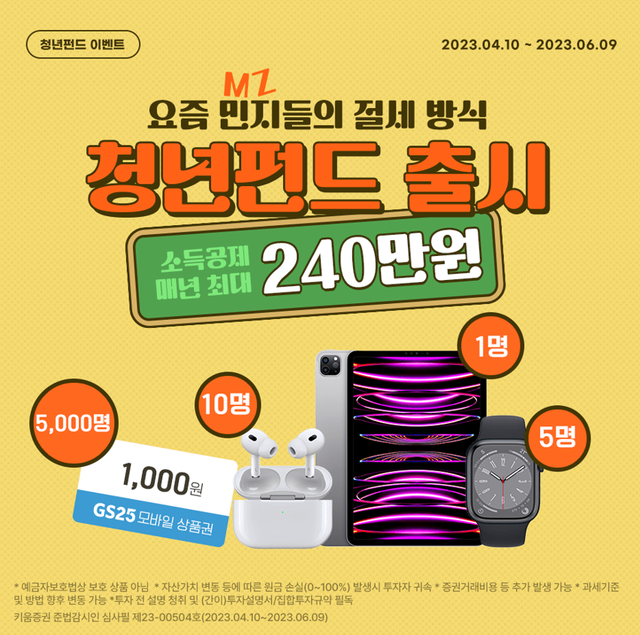 키움증권은 청년형 소득공제 장기펀드 판매를 기념해 아이패드, 애플워치, 에어팟, GS25 상품권을 지급하는 이벤트를 6월초까지 진행 중이라고 16일 밝혔다.청년펀드를 이벤트 기간 내 가입하는 고객 대상으로 아이패드 프로 1명, 애플워치 8세대 5명, 에어팟 프로2 10명을 추첨해 경품을 지급한다.청년펀드 가입 시 사용할 수 있는 전용 쿠폰 1만원도 전원 지급하며, 해당 이벤트를 친구들에게 5번 이상 공유한 고객은 GS25 모바일 상품권도 추첨을 통해 받을 수 있다.회사 관계자는 “청년층의 절세 상품에 대한 관심이 지속적으로 높아지고 있다”며 “이번 기회에 신규 소득공제 상품에 가입하고 미리 연말정산을 준비하는 것과 동시에 기간 한정 이벤트 혜택을 누리길 바란다”고 말했다.