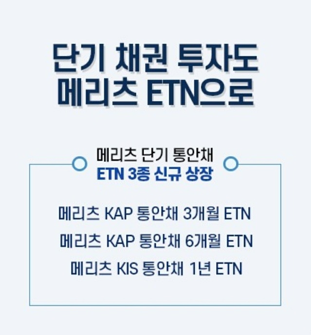 메리츠증권은 단기 통화안정채권(통안채)에 투자할 수 있는 ETN 3개 종목을 지난 17일 상장, 단기 채권 ETN 상품 라인업을 확대했다고 18일 밝혔다.