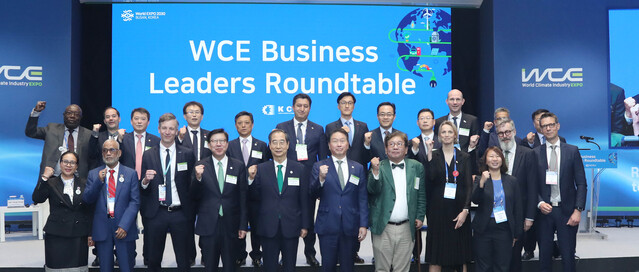 대한상공회의소가 25일 '지속가능한 미래를 위한 기업의 역할'을 주제로 기후산업국제박람회(WCE) 비즈니스 리더 라운드테이블을 개최했다.개막식에 이어 진행된 비즈니스 리더 라운드테이블에는 최태원 대한상공회의소 회장을 비롯, 한덕수 국무총리, 김상협 탄녹위 위원장, 한화진 환경부 장관, 강경성 산업부 2차관, 어명소 국토부 2차관, 송상근 해수부 차관 등 우리 정부와 우즈베키스탄, 가나, 라오스, 방글라데시, 캄보디아, 오만, 이집트 등 외국 정부 장·차관급 인사가 참여했다.삼성, SK, 현대기아차, LG, 포스코, HD현대, 카카오 모빌리티 등 국내 기업들과 구글.엑슨모빌(미국), RWE.폭스바겐(독일), 에퀴노르(노르웨이), 오스테드(덴마크) 등 탄소중립 글로벌 선도 기업들도 참석했다.최태원 대한상의 회장은 "기후 위기에 대처하기 위한 탄소중립은 이제 경제, 산업, 통상, 일자리 등 사회 전 분야에 이미 현실화가 되고 있다"며 "기업들은 상용화된 감축 기술을 적용해서 탄소 배출 효율을 높이는 방식으로 대응했지만 실제 탄소중립을 위해서는 파괴적 혁신이 필요하다"고 말했다.욜린 앙 구글 아태 사업개발 총괄 부사장은 '지구를 위해 더 많은 일을 할 수 있도록 돕는 기술' 발표를 통해 "구글은 2017년에 이미 탄소중립을 달성했고 전세계에서 최초로 100% 재생에너지 전력을 사용하는 기업이 됐다"며 "2020년부터는 56억달러에 달하는 녹색채권을 발행하고 있으며 탄소감축 제품·기술·서비스를 개발하고 있다"고 전했다.