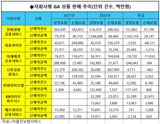 실제 26일 이클린보험서비스에 따르면 지난해 생보사 자회사 GA 7곳(한화생명금융·피플라이프·미래에셋생명금융·신한금융·한화라이프랩·KB라이프파트너스·메트라이프금융서비스 등)의 신계약건수는 생명보험상품 71만4001건, 손해보험상품 89만5370건 등 160만9371건으로 집계됐다.
