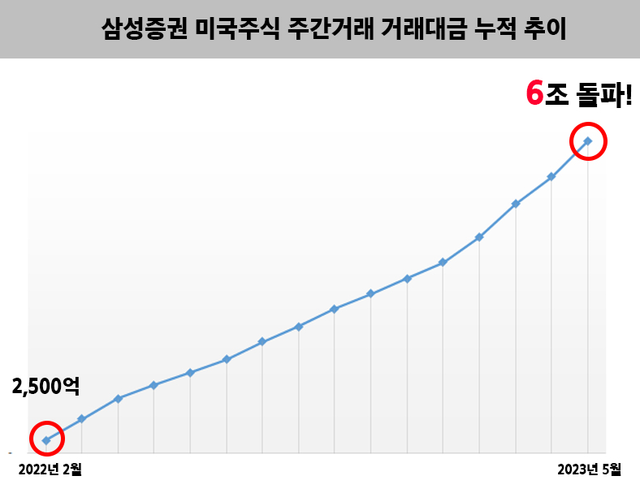 삼성증권은 지난해 2월 개시한 미국주식 주간거래 서비스의 누적 거래금액이 6조원을 넘어섰다고 12일 밝혔다.지난 5월 25일 하루동안 거래된 미국 주식 주간 거래 거래대금은 약 810억원으로(약 6230만 달러), 올해 일평균 거래대금인 248억원 대비 3배가 넘는 큰 금액이다.5월부터 늘어나기 시작한 미국 주식 주간거래 거래대금은 계속 상승세를 이어가고 있는데 실제로 작년 5월 한 달간의 미국 주식 주간거래 일간 평균 거래대금이 2배 이상 증가했다.5월 이후 주단위 거래량은 30.5%씩 상승하면서 5월 25일에 최고 거래대금을 기록했다. 그 이후로도 26일(약 316억원), 30일(717억원) 늘어나고 있는데, 특히 5월 30일 거래대금은 25일에 이어 서비스 출시 이후 두 번째 많은 거래대금을 기록했다.지난 5월 30일은 미국 부채한도 협상 관련한 리스크가 일부 해소된 날로, 경기 침체 전망으로 미국 주식 시장에 등을 돌렸던 서학개미 턴어라운드 현상을 엿볼 수 있었다.5월 25일 거래 고객을 특성별로 분석해보면, 50대와 60대의 거래대금이 전체 대비 각각 29.5%, 22.0%로 이 중 절반 가량은 PB를 통해 거래한 것으로 나타났다.실적 발표 이후 주간 거래 이용자의 엔비디아 평균 매수가는 365.89달러로 그 날 저녁 정규장의 종가(379.80달러)를 기준으로 하루만에 4%에 가까운 수익을 거뒀다. 엔비디아의 실적 발표 직후 발빠르게 대응한 국내 서학개미들이 미국 현지 투자자보다 높은 수익을 거뒀을 것으로 분석된다.5월 25일 주간 거래 서비스를 통해 가장 많이 거래된 종목은 엔비디아로 총 거래대금의 49.9%를 차지했고, 마이크로소프트, 테슬라, AMD, Direxion Daily Semiconductors 3배 ETF(SOXL) 등이 뒤를 이어 엔비디아발 훈풍에 따른 반도체 관련 주요 거래 종목에 이름을 올렸다.이날 하루 엔비디아의 주가는 24.37% 상승했고, AMD의 주가도 11.16% 올랐다.회사 관계자는 "기준 금리 인상과 경기 침체 우려 등으로 미국 주식 시장을 떠나있던 서학개미가 다시금 미국 주식 시장으로 머니무브하고 있는 것으로 보인다"며 "삼성증권은 고객들이 시장에 빠르게 대응할 수 있도록 주간거래 뿐만 아니라 신속한 투자정보 제공을 위한 서비스도 확대해 나갈 것"이라고 밝혔다.