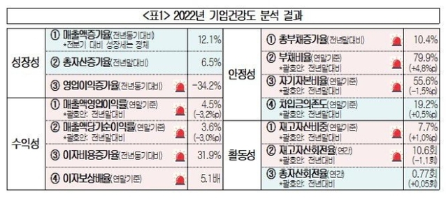 지난해 국내 1612개 상장사의 영업이익이 전년 대비 3분의 1가량 줄어든 것으로 나타났다. 반대로 고금리 여파로 이자 비용은 3분의 1가량 증가해 부채 상환능력을 나타내는 이자보상배율이 절반 수준으로 떨어졌다. 기업의 수익성 지표에 경고등이 켜졌다는 평가가 나온다.12일 대한상공회의소가 한국평가데이터와 함께 1612개 상장사(대기업 159개·중견기업 774개·중소기업 679개)의 재무 상황을 분석한 결과에 따르면 조사 대상 기업의 지난해 영업이익은 34.2% 감소했다. 코로나19가 한창이던 2020년과 2021년 영업이익이 전년 대비 각각 22.7%와 60.8% 증가한 것과 대조된다.규모별로는 대기업 영업이익이 44.1% 급감했다. 중견기업은 9.2% 증가했으며, 중소기업은 3.1% 감소했다. 대한상의는 지난해 4월 이후 무역수지가 15개월 연속 적자를 기록하는 등 수출이 매우 좋지 않은 상황에서 수출 최전선에 있는 대기업을 중심으로 영업이익이 크게 줄어든 것으로 보인다고 분석했다.반면 지난해 조사 대상 기업의 이자 비용은 14조2000억원이었다. 금리가 오르면서 기업이 부담해야 할 이자 비용은 전년 대비 31.9% 증가했다. 기업이 벌어들인 영업이익으로 이자를 갚을 수 있는 능력을 나타내는 이자보상배율은 5.1배로 전년(10.1배)과 비교해 반토막이 됐다. 이자보상배율은 영업이익을 이자 비용으로 나눈 값이다.기업의 안정성도 악화했다. 조사 대상 기업의 부채비율은 79.9%로 전년 대비 4.8%포인트 상승했다. 기업 규모별로 보면 대기업의 부채비율은 전년 대비 4.6%포인트 오른 77.5%를 나타냈다. 중견기업은 전년보다 6.2%포인트 오른 96.2%, 중소기업은 0.4%포인트 오른 44.5%로 집계됐다. 기업의 총자본에서 부채를 제외한 자기자본의 비중을 나타내는 자기자본비율은 전년 대비 1.5%포인트 하락한 55.6%를 기록했다. 이는 최근 4년 중 가장 낮은 수치다.기업의 활동성을 측정하는 지표도 나빠졌다. 총자산에서 재고자산이 차지하는 비중은 최근 4년 중 가장 높은 수준인 7.7%로 나타났다. 재고자산이 매출로 이어지는 속도를 나타내는 지표인 재고자산회전율은 10.6회로 전년(11.7회)보다 하락했다. 회전율이 높을수록 재고자산이 매출로 빠르게 이어지는 것을 의미한다.강석구 대한상의 조사본부장은 "영업이익은 크게 깎이고 기업의 부채 부담만 눈덩이처럼 불어나 기업 현장의 우려가 큰 상황"이라며 "기업 활력 회복과 경기 활성화를 위해 선제적 통화정책을 고려할 필요가 있다"고 말했다.