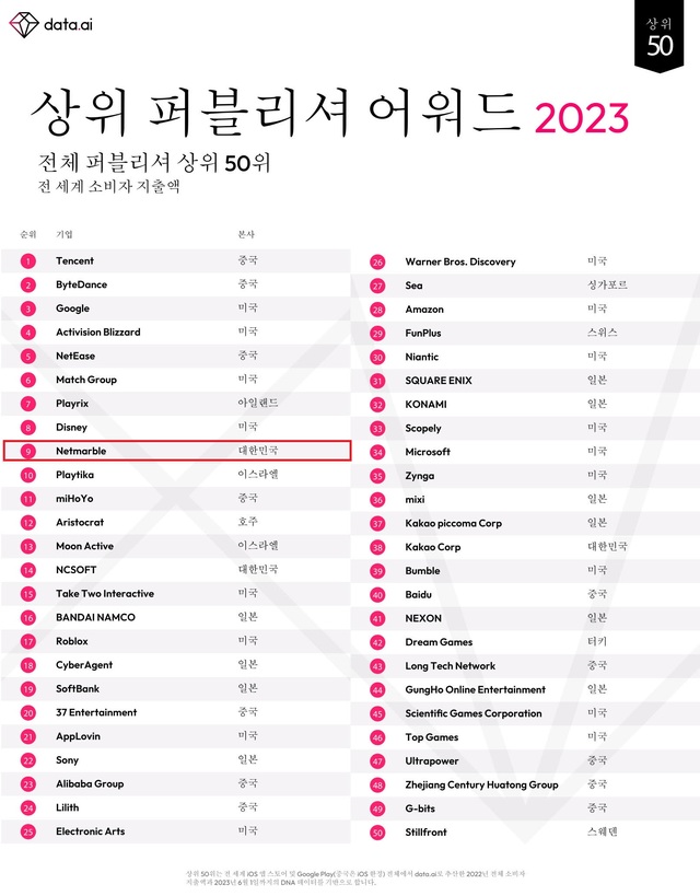 넷마블은 지난해 글로벌 모바일 시장 매출을 기준으로 우수 퍼블리셔를 선정하는 data.ai의 ‘2023년 상위 퍼블리셔 어워드’에서 9위에 올랐다고 28일 밝혔다.모바일 앱 마켓 분석 사이트 data.ai는 매년 구글 플레이스토어 및 애플 앱스토어의 수치를 합산해 전 세계에서 가장 높은 수익을 기록한 상위 모바일 앱 퍼블리셔를 선정하고 있다.올해로 11회째를 맞이한 본 어워드에서 넷마블은 2015년을 시작으로 8년 연속 꾸준히 Top10에 진입했다. 국내 기업으로는 유일하게 세계 모바일 시장에서 Top10에 오르는 기록을 이어가며 글로벌 퍼블리셔로서의 경쟁력을 공고히 했다. 아시아태평양 지역에 본사를 두고 있는 상위 퍼블리셔 중에서는 4위에 해당한다.넷마블은 올해 하반기 다양한 신작 출시를 앞두고 있다. 오는 7월 ‘신의 탑: 새로운 세계’를 필두로 8월 ‘그랜드크로스: 에이지오브타이탄’, 9월 ‘세븐나이츠 키우기’를 연이어 선보일 예정이다. 또 연내 출시를 목표로 ‘킹 아서: 레전드 라이즈’, ‘아스달 연대기’, ‘나 혼자만 레벨업:ARISE’ 등을 개발 중이다.이외에도 ‘일곱 개의 대죄’, ‘A3: 스틸얼라이브’, ‘샵타이탄’, ‘신석기시대’, ‘제2의나라: 크로스월드’ 등 5종의 타이틀이 연내 중국 시장에 출시될 예정이다.