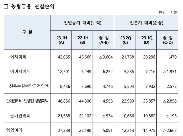 이자이익 4.2조… 신 회계제도 도입 영향비이자이익 1.2조… 전년比 100% 증가농업지원사업비 2464억· 대손충당금 6997억