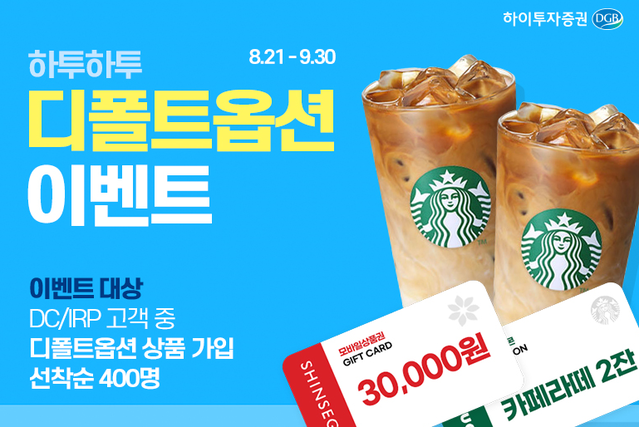 하이투자증권은 9월 30일까지 퇴직연금 디폴트옵션 상품 가입 이벤트를 진행한다고 21일 밝혔다.퇴직연금 DC형 및 IRP 상품 가입 고객 중 이벤트 기간 내 디폴트옵션 상품에 가입하는 경우 가입금액별 선착순으로 사은품을 지급한다.디폴트옵션 상품 중 초저위험 상품은 이벤트 대상에서는 제외되며, 이벤트 종료일까지 기준금액 이상 잔고를 유지하는 경우 참여가 가능하다.가입금액이 100만원 이상일 경우 1만원 상당의 커피 쿠폰(300명), 1000만원 이상이면 백화점 상품권 3만원권(100명)을 선착순으로 지급한다.이 회사의 디폴트옵션 상품인 ‘하이투자증권 디폴트옵션 고위험 TDF 3호’가 지난 2분기 말 기준 6개월 수익률 11.34%를 기록하는 등 우수한 성과를 보인다.디폴트옵션 상품의 가입은 회사 영업점을 통해서 진행할 수 있으며, 스마트폰 모바일트레이딩시스템(MTS ‘iM 하이’)과 회사 홈페이지를 통해서도 가능하다.연금지원부 관계자는 “디폴트옵션 제도는 시간과 경험의 부족으로 운용되지 못하고 방치될 수 있는 퇴직연금의 수익률을 제고할 수 있는 제도”라며 “디폴트옵션 제도의 활용은 검증된 우수한 상품 가입을 통한 퇴직연금 수익률 제고로 노후 소득 재원을 확충하는 유용한 수단이 될 것”이라고 밝혔다.