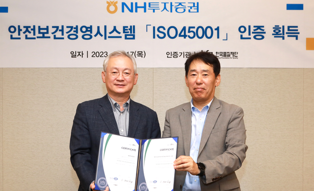 NH투자증권은 안전보건 국제표준(ISO45001) 인증을 획득했다고 21일 밝혔다.인증 수여식은 지난 17일 서울 여의도 NH금융타워에서 정영채 대표이사와 송지영 한국품질재단 대표 등이 참석해 진행됐다.ISO45001은 국제표준화기구가 제정한 안전보건경영체계에 관한 국제표준 인증이다. 사업장에서 발생할 수 있는 각종 위험을 사전 예측 및 예방해 조직의 안전보건을 체계적으로 관리하고 있음을 의미한다회사는 국내 법규와 국제기준에 부합하는 안전보건 활동을 전개함을 높이 평가받았다. 안전보건을 준수한 업무환경은 물론 EAP(Employee Assistance Program)를 운영해 임직원 및 임직원의 직계가족에게 건강과 심리건강 증진에 앞장서고 있다. 직원 및 임직원 가족을 대상으로 심리상담 프로그램과 건강 검진 및 단체상해보험에 가입해 사고 및 질병에 대비하고 있다.또한 매년 소방훈련을 통해 소방 시설물의 이해 및 비상상황시 직원들의 대처방법에 대한 교육을 실시하고 있다. 이 회사는 최근 3개년 산업재해 및 안전사고 0건으로 운영성과를 보여주고 있다.정영채 대표이사는 “안전보건관리체계 고도화와 성숙한 안전보건 문화 정착을 도모해 근로자가 안심하고 근무할 수 있는 근무환경을 조성하겠다”며 “지속가능 성장을 통한 고객가치 제고 및 사회적 가치 창출을 위해 노력하고 우리 사회에 긍정적인 영향을 미치는 ESG 기업으로 거듭날 수 있도록 하겠다”고 밝혔다.