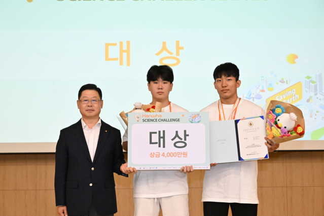 수차의 날개는 형상에 따라 추력 특성이 달라진다는 점에 착안해 저유속에서도 발전 가능한 접이식 날개 수차를 시제작하기도 했다.금상은 산성토에서 식물을 보호하고 다양한 작물 재배에 용이한 산 저항성 영양제를 연구한 미스매치팀(하나고 김아영, 유명철 학생, 지도교사 박찬규)과 폐해조류와 택배박스를 활용해 새집증후군 잡는 친환경 벽지와 풀 제작에 관한 연구를 진행한 EcoSeaWeed팀(하동여고 김아영, 이자현 학생, 지도교사 이규희)이 수상했다.'한화사이언스챌린지 2023'은 상금과 부상이 총 2억원으로, 대상팀에게는 4000만원, 금상 2팀에 각 2000만원, 은상 2개팀에 각 1000만원의 상금이 수여된다.