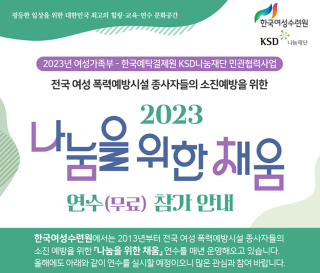 한국예탁결제원 KSD나눔재단은 소외계층지원시설 종사자의 소진(Burn out) 예방을 위한 연수 프로그램 운영을 위해 지난 31일 (재)한국여성수련원에 8000만원을 후원했다고 1일 밝혔다.강원도 강릉시에 위치한 (재)한국여성수련원에서 진행되는 연수는 전국 젠더(여성)폭력예방시설 종사자를 대상으로 하는 ‘나눔을 위한 채움 연수’와 사회복지시설 종사자를 대상으로 하는 ‘나를 위한 행복충전 연수’로 나눠 진행된다. 오는 10월 11일부터 11월 22일까지 6회에 걸쳐 총 240명을 지원할 예정이다.이를 위해 수련원에서는 2박3일 동안 참가자 간 유대관계 형성, 생활 속 금융 및 재무설계, 개인 힐링체험 등 직무 스트레스 해소와 소진 방지 재충전을 위한 다양한 연수 프로그램을 마련해 운영할 계획이다.참가를 희망하는 종사자는 9월 11일까지 수련원에 참가신청이 가능하며, 자세한 신청방법 및 연수일정 등은 수련원 홈페이지 공지사항에서 확인할 수 있다.예탁결제원은 2013년 여성가족부와 여성폭력 근절을 위한 업무협약을 체결하고, 나눔재단을 통해 소외계층지원시설 종사자의 소진예방과 치유(힐링) 및 재충전의 기회를 매년 제공해 오고 있다.더 많은 종사자가 연수에 참여할 수 있도록 지난해부터는 사회복지시설 종사자까지 연수 대상자를 확대했다.이순호 재단 이사장은 “이번 연수가 열악한 근무조건과 어려운 경제여건 속에서도 사랑과 헌신으로 소외계층과 우리 사회 아픈 곳을 돌보는 종사자들에게 작은 위로와 격려의 시간이 되길 바란다”고 밝혔다.
