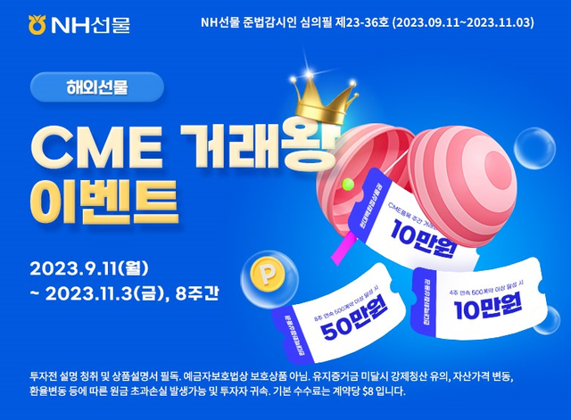 NH선물은 해외선물 거래 고객을 위한 혜택 이벤트로 ‘CME거래왕 이벤트’를 11월 3일까지 진행한다고 13일 밝혔다.이번 이벤트에서는 NH선물에 상장된 CME(시카고 상업 거래소)의 전품목을 대상으로 8주 동안 주간 거래량 달성 시 현대백화점 상품권을 증정한다.주간 거래량 500계약 이상 달성 시 10만원 권의 현대백화점 상품권을 제공하며, 4주 연속 500계약 이상 달성 시 추가 10만원권의 상품권이 더 증정된다. 8주 연속 500계약 이상 달성 고객에게는 앞선 혜택에 더해 50만원권의 상품권이 지급된다.다만 Micro품목 1계약은 0.25계약으로 산정됨에 주의해야 한다.신청 방법은 별도의 신청 절차 없이 이벤트 기간 동안 자동으로 이벤트에 참여하게 된다.거래량 미션을 달성한 고객들에게는 주간 정산 후 이벤트 종료와 함께 합산 상품권이 지급된다.해외선물 수수료 할인혜택도 중복해서 받을 수 있다. 해외선물 편도거래 기준으로 일반 및 미니 상품은 계약당 2.39 달러, 마이크로 상품은 계약당 0.79 달러의 수수료 할인 혜택이 제공된다.회사 관계자는 "기존 해외선물수수료 이벤트와 함께 매달 진행 예정인 해외선물 이벤트를 통해 NH선물 해외선물 고객만의 혜택을 경험해보길 원한다"며 "금번 CME거래왕 이벤트의 후속으로 CME품목왕 이벤트도 10월 중 개최 예정"이라고 밝혔다.