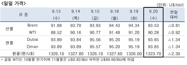 미국 연준이 고금리 장기화를 시사하면서 국제유가가 하락했다.20일 한국석유공사에 따르면 20일(현지시간) 미국 서부텍사스산원유(WTI) 가격은 배럴당 90.28달러로 전날보다 0.92달러 하락했다.브렌트(Brent)유는 전일 대비 배럴당 0.81달러 떨어진 93.53달러에 마감했다. 중동산 두바이(Dubai)유는 93.85달러로 전일 대비 1.34달러 하락했다.연준은 시장 예상대로 기준금리를 5.25∼5.50%로 동결했다. 하지만 연말까지 한 차례 추가 금리 인상을 예고하며 매파적 입장을 강화한 후 유가는 1주일 만에 최저 수준으로 내려왔다.연준 위원들은 올해 금리가 현재보다 0.25%포인트(p) 높은 5.50%~5.75% 수준에서 정점을 찍을 것으로 내다봤다. 인플레이션을 억제하기 위한 금리 인상이 경제 성장을 둔화시키고 원유 수요를 감소시킬 수 있다는 우려도 나온다.시장 관계자들은 "추가 금리 인상과 달러 강세, 유가 상승이 결합되면 경기 침체 가능성도 높아질 것"이라고 말했다.미국 에너지정보청(EIA)이 발표한 주간 보고서에 따르면 15일로 끝난 한 주간 원유 재고는 전주 대비 213만6000배럴 감소한 4억1845만6000배럴로 나타났다.휘발유 재고는 83만1000배럴 줄어든 2억1947만6000배럴, 디젤 및 난방유 재고는 286만7000배럴 감소한 1억1966만6000배럴로 집계됐다. 원유 재고 감소 폭은 전문가 예상치보다 컸다.정유사의 정제 마진인 '크랙 스프레드'(crack spread)는 지난해 12월 이후 최저치로 떨어졌다.