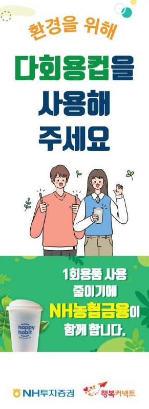 NH투자증권은 농협금융의 친환경 경영 및 ESG 실천문화 확산을 위해 다회용컵 사용 캠페인을 추진한다고 21일 밝혔다.임직원이 다회용 컵을 무상으로 사용할 수 있도록 회사 차원에서 제공해 온실가스 배출 감축에 기여하겠다는 취지다.회사는 해피해빗과 함께 임직원 대상 일회용 컵 사용 줄이기 캠페인을 올해 연말까지 실시할 예정이다. 이번 캠페인은 임직원이 무상으로 비치된 다회용 컵을 사용하고 2개 층에 설치된 반납기에 넣는 방식으로 다회용컵 사용을 독려할 계획이다.수거된 컵은 전문업체로 전달돼 7단계의 세척 및 소독 과정을 진행한다. 본사 임직원 1200명이 1일 1개의 일회용 컵(종이 또는 플라스틱)을 사용하지 않으면, 1년에 약 11톤 정도의 온실가스 배출량이 감소된다.최홍석 ESG추진부장은 “NH투자증권은 작년 8월 텀블러 세척기를 도입해 텀블러나 개인컵을 사용하는 직원이 많아졌다”며 “개인컵 사용이 증가한 만큼 휴대용으로 다회용컵을 사용하는 직원들도 많아질 것 같다”고 밝혔다.그는 “다양한 환경보호 캠페인을 통해 NH투자증권 임직원은 앞으로 일회용품 줄이기 뿐만 아니라 환경보호에도 앞장서 나갈 것”이라고 덧붙였다.회사에선 이번 캠페인뿐만 아니라 다양한 ESG 활동을 통해 임직원의 참여와 공감을 이끌어내고 있다.지난 5월 ‘With Green 워킹×플로깅’ 활동을 통해 임직원 1393명이 목표1억걸음 달성에 참여, 총 2억2947만5070걸음을 초과 달성해 환경실천연합회에 3000만원을 기부했다. 또한 유명 커피 기업과 함께 커피캡슐 재활용에 동참하는 등 ESG 경영에 앞장서고 있다.