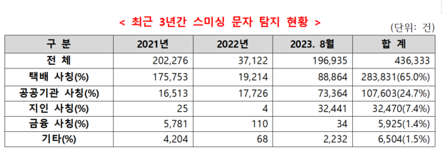 정부가 추석 명절 기간 택배 배송, 교통범칙금 조회를 사칭한 '스미싱'이 급증, 이용자의 피해 주의를 당부했다.21일 관련 업계에 따르면 스미싱은 문자메시지(SMS)와 피싱(Phishing)의 합성어다. 악성 앱 주소가 포함된 휴대폰 문자메시지를 전송하여 이용자가 악성 앱을 설치하거나 전화를 하도록 유도해 금융정보·개인정보 등을 탈취하는 수법이다.최근 3년간 스미싱 피해 현황을 분석해 보면 택배 배송 사칭 유형이 28만여 건으로 전체의 약 65%를 차지하고 있다. 이번 추석 명절에도 명절기간을 전후로 가족 친지, 지인 간 선물배송이 증가하는 상황을 악용하는 스미싱 문자가 다량 유포될 가능성이 높다.코로나 엔데믹으로 외부 활동이 늘어남에 따라 건강검진, 교통 범칙금 등 공공기관 사칭 및 청첩장, 부고장 등 지인을 사칭하는 유형도 증가 추세다. 추석을 앞두고 고향 방문 등 차량 이동 증가를 틈탄 교통위반 범칙금 조회나 안부인사 등을 사칭하는 악성 문자도 지속 유포될 것으로 보고 있다.이에 정부는 국민들이 편안한 추석 명절을 보낼 수 있도록 관계부처들과 협력해 24시간 사이버 안전 대응체계를 마련하다. 과기정통부와 KISA는 추석 연휴기간 동안 문자사기에 신속하게 대응할 수 있도록 24시간 탐지체계를 운영한다. 신고·접수된 문자사기 정보를 분석하여 피싱 사이트, 악성 앱 유포지 등에 대한 긴급 차단조치를 통해 국민들의 피해를 최소화할 계획이다.전문적인 지식이 없어도 내 PC와 모바일 기기의 정보보안 수준 및 취약점을 점검할 수 있도록‘내PC·모바일 돌보미’ 서비스도 제공한다. 고령층, 장애인, 아동 등 정보보호 실천이 어려운 디지털 취약계층을 지원하기 위해 노인․장애인 복지센터, 키움 아동센터 등에 보안 전문가가 직접 방문하는 보안점검 서비스를 진행하다.이통사와 공동으로 보이스피싱 신종 수법 피해 예방을 위해 전국 2만 3000개 휴대폰 판매 유통점과 인터넷 홈페이지 등을 통해 명의도용방지서비스 대국민 홍보도 진행한다. 방통위는 이통3사, 한국정보통신진흥협회(KAIT)와 협력해 가입자에게 '스미싱 문자 주의 안내' 문자 메시지를 순차 발송하고 있다.금융위원회와 금융감독원은 금융권과 공동으로 문자사기와 보이스피싱 피해 예방을 위한 집중 홍보기간을 운영한다. 피해 예방 방법과 피해 발생 시 대응 요령을 포스터, 리플렛, 만화 영상 등으로 제작하여 국민들에게 배포할 계획이다.경찰청은 문자사기 피해 예방을 위해 경찰청 홈페이지와 모바일 앱인 ‘사이버캅’을 통해 예방 수칙·피해 경보 등을 제공한다. 추석 연휴 기간 전후로 발생하는 문자사기, 직거래 사기 등 서민 생활을 침해하는 사이버상 악성사기에 대해 단속을 강화할 계획이다. 사이버범죄 피해를 입은 경우 112나 사이버범죄 신고시스템(ECRM)을 이용해 신고를 접수할 수 있다.