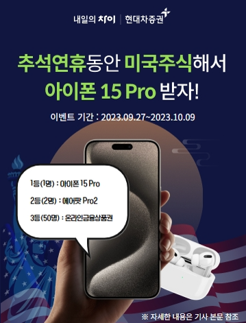 현대차증권 10월 9일까지 조건을 충족한 미국주식 거래 고객을 대상으로 추첨을 통해 경품을 지급하는 이벤트를 진행한다고 27일 밝혔다.이벤트 대상은 이벤트 기간 내 미국주식을 1000달러 이상 거래한 개인 고객이며 1000달러 거래 단위로 추첨권 1장을 지급한다. 거래 금액은 계좌별 매수 또는 매도 체결 기준이며, 별도 이벤트 신청 절차 없이 거래 금액이 1000달러 이상이면 자동으로 이벤트에 참여된다.이벤트 대상 고객은 추첨을 통해 아이폰 15 Pro(1명), 에어팟 Pro2(2명), 현대차증권 플러스 금융상품권 1만원권(50명) 등을 경품으로 지급받을 수 있다. 경품으로 지급되는 금융상품권은 국내외 주식, 펀드, 연금저축펀드 등 다양한 금융상품에 투자할 수 있는 온라인 금융상품권이다.한편 회사는 미국주식 등 해외주식을 유선을 통해 거래할 수 있는 해외주식 데스크를 추석 연휴에도 운영할 계획이다.스마트금융센터를 이용하면 해외주식 데스크로 연결이 가능하며 오후 5시부터 익일 오전 7시까지 미국주식을 포함한 해외주식 관련 업무 처리가 가능하다.