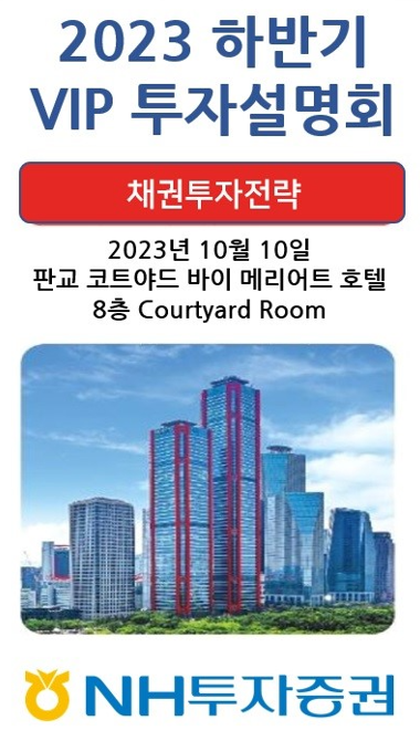 NH투자증권은 오는 10일 오후 3시 경기도 판교 코트야드바이메리어트호텔에서 경기권역 VIP고객을 대상으로 ‘채권 투자 전략’ 설명회를 개최한다고 6일 밝혔다.VIP 투자설명회 주제는 ‘자산 배분 및 투자를 위한 국내외 채권투자전략’으로 경기권역 7개 센터(분당금융 WM1센터, 분당금융 WM2센터, 판교Biz Plus금융센터, 수지WM센터, 과천WM센터, 수원금융 WM1센터, 수원금융 WM2센터)에서 주관한다.1부는 강승원 FICC리서치부 연구위원이 글로벌 통화정책 및 금리전망에 대해 강의하고, 2부에서는 김선익 채권상품부 과장이 국내외 절세채권과 달러 포트폴리오를 활용한 장단기 채권투자전략에 설명한다. 설명회 후에는 간단한 대면 질의응답 시간을 마련할 예정이다.설명회는 사전 예약을 통해 무료로 진행되며, 자세한 내용은 영업점 내 관리직원에게 문의하면 된다.경기권역 7개 센터는 WM사업부와 재경본부 전략 방향성에 기반해 경기권역 핵심고객에게 글로벌 통화정책 및 금리전망을 통한 채권 투자에 대한 구체적인 전략을 제시한다는 계획이다.