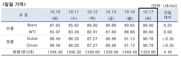 팔레스타인 무장 정파 하마스와 이스라엘 전쟁의 확전 우려가 커지지면서 국제유가가 상승했다. 다만 조 바이든 미국 대통령 이스라엘 방문을 앞두고 중동 사태를 주시하면서 WTI는 보합세를 보였다.18일 한국석유공사에 따르면 17일(현지시간) 미국 서부텍사스산원유(WTI) 가격은 배럴당 86.66달러로 전날과 동일가격에 거래를 마쳤다.브렌트(Brent)유는 전일 대비 배럴당 0.25달러 오른 89.90달러에 마감했다. 중동산 두바이(Dubai)유는 90.78달러로 전일 대비 0.35달러 하락했다.유가 상승 요인으로는 이스라엘과 팔레스타인의 무력충돌에 따른 중동발 공급 불안이 지목됐다.바이든 대통령은 오는 18일 이스라엘과 요르단을 각각 방문할 예정이다. 시장에서는 바이든 대통령 방문이 중동에서의 갈등 확대를 막을 수 있을지 지켜보고 있다.베네수엘라 정부·여당과 야당 대표단은 전날 내년으로 예정된 대통령선거를 앞두고 '공정·민주 선거 보장'을 위한 선거 조건을 논의하기 위한 대화를 재개하기로 했다.