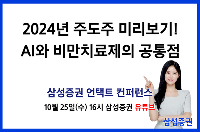 삼성증권은 오는 25일 수요일 오후 4시 '2024년 주도주 미리보기! AI와 비만 치료제의 공통점'을 주제로 '언택트 컨퍼런스'를 유튜브 생방송으로 개최한다고 23일 밝혔다.이는 애널리스트간 토론하는 방식으로 진행될 예정이다. 임은영 EV·모빌리티팀장, 이종욱 비상장솔루션팀장, 제약·바이오 담당 서근희 수석연구위원, 의료기기 담당 정동희 선임연구원 그리고 정명지 투자정보팀장이 패널로 참여해 관련 주제에 대해 토론한다.최근 투자자들의 관심이 높은 '생성형AI 관련주', '역노화 관련주' 등의 주요 업종을 분석하고 전망하는 내용들로 구성될 예정이다.영상은 행사 후 유튜브 채널에 업로드된다.이번 행사에 사전 접수를 마친 고객 등을 대상으로 이벤트도 진행될 예정이다.컨퍼런스 사전 신청 후 삼성금융네트웍스 통합앱인 모니모를 10월 25일까지 신규 가입한 고객 중 선착순 2000명에게 커피 기프티콘을 증정한다.컨퍼런스 라이브 시청 고객 중 진행하는 설문에 응답한 고객을 대상으로 3000명을 추첨해 커피 기프티콘을 제공한다.윤석모 리서치센터장은 "의료기기 업종은 고금리 및 소비경기 둔화에도 견고한 실적을 기록하는 등 향후 성장성에 대한 투자자들의 관심이 높아지고 있다"며 "'AI와 비만 치료제의 공통점'을 주제로 2024년 증시 주도주에 대한 힌트를 얻을 수 있을 것"이라고 밝혔다.