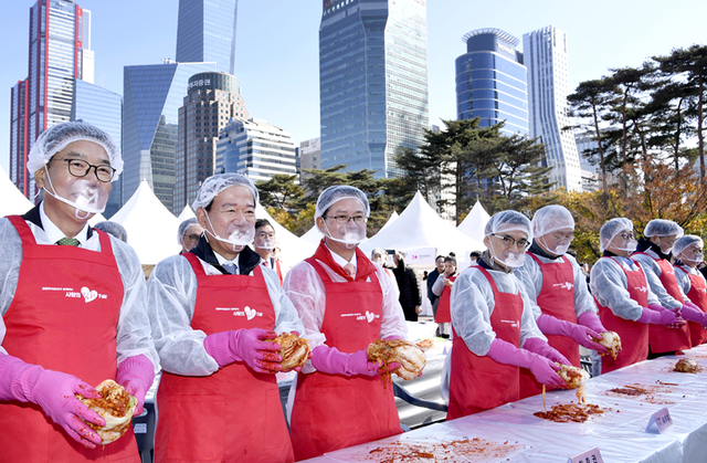 금융투자협회는 14일 서울 여의도공원에서 금융투자업계 및 증권유관기관과 공동으로 ’제13회 사랑의 김치페어' 김장행사를 펼쳤다고 밝혔다.이날 행사에는 협회를 비롯, 65개 금융투자회사 및 증권유관기관의 CEO 40명과 직원 700여명이 동참했다.총 5만Kg의 김치가 초록우산 어린이재단 및 금융투자회사가 후원하는 복지시설 150여 곳에 전달됐다.소외된 이웃의 월동을 지원하기 위해 2011년에 시작해 13번째를 맞는 행사는 참여인원과 기부김장의 양도 매년 증가하면서 금융투자업계를 대표하는 사회공헌 행사로 자리매김하고 있다.이날 행사에는 서유석 금융투자협회장, 황영기 초록우산어린이재단 회장을 비롯해 금융투자회사 및 증권 유관기관 대표가 참석했다.또 백혜련 국회 정무위원장과 윤한홍 의원(정무위원회 국민의힘 간사), 김종민 의원(정무위원회 더불어민주당 간사), 최호권 영등포구청장이 방문해 기부행사를 격려해 눈길을 끌었다.서유석 회장은 “오늘 행사가 작지만 우리 업계가 사회적 나눔에 기여하고 앞으로 결속해 나아가는 하나의 계기가 되기를 바란다. 금융투자업계는 앞으로도 여러 사회공헌활동을 지속적으로 추진하도록 하겠다”며 “최근 글로벌 트렌드가 된 김치처럼 우리 금융투자업계도 우리 고유의 특색과 강점을 바탕으로 세계무대에서 성장할 수 있도록 노력하겠다”고 밝혔다.