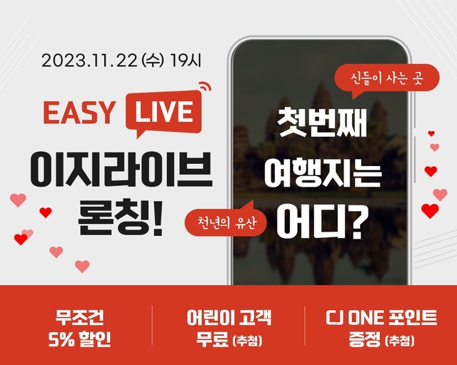 교원투어 '여행이지'가 라이브커머스 채널 '이지라이브(Easy Live)'를 론칭했다고 20일 밝혔다.이지라이브는 실시간 소통 및 양방향 상호작용을 기반으로 고객에게 여행상품에 대한 더 많은 정보와 혜택을 제공하고, 최신 여행 트렌드와 라이브에 특화된 콘텐츠를 전달하기 위한 목적으로 도입됐다.여행이지는 오는 22일 오후 7시 이지라이브 첫 방송을 진행한다. 이날 방송에서 씨엠립 전세기 상품을 소개하고 상품에 대한 시청자들의 궁금증을 해소해줄 예정이다. 예약 방법과 캄보디아 여행 정보, CJ ONE 포인트 전환 및 사용 등과 관련된 콘텐츠도 선보일 계획이다.시청자를 위한 혜택도 마련했다. 씨엠립 전세기 상품 10만원 할인과 함께 모든 시청자에게 추가 5% 할인 혜택을 제공한다. 상품 예약내역을 인증한 시청자를 대상으로 추첨을 통해 2명에게 CJ ONE 10만 포인트를 증정한다. 방송에서 소통에 적극 참여한 시청자 2명에게는 CJ ONE 5만포인트를 제공한다.여행이지 관계자는 “고객 접점 강화와 더불어 새로운 콘텐츠를 제공하고자 이지라이브를 론칭하게 됐다”며 “앞으로 이지라이브를 통해 매력적인 여행상품과 차별화한 콘텐츠를 선보이는 것은 물론, 시청자들과 실시간으로 소통하면서 양질의 여행 정보를 제공할 예정”이라고 말했다.