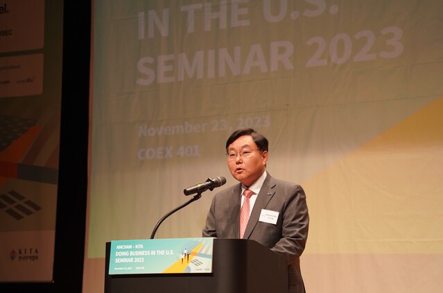 내년 미국 대선을 앞두고 우리 기업들이 현지 정치·산업 지형 변화에 주목해야 한다는 의견이 나왔다.한국무역협회는 23일 삼성동 코엑스에서 주한미국상공회의소(AMCHAM)와 공동으로 ‘2024 미국 경제·정책 전망 및 시장 진출 세미나’를 열고 이 같은 내용을 다뤘다.행사에는 김현철 한국무역협회 상임감사, 제임스 김 주한미국상공회의소 회장과 기업인 약 300명이 참석했다.세미나에서는 △내년도 미국 경제 정책 및 통상 환경 전망 △미국 진출 성공 사례 △미국 진출을 위한 투자·세무·비자 △인재 채용 고려 사항 △미국 기술 정책 동향에 대한 발표가 진행됐다.김현철 상임감사는 "올해로 70주년을 맞은 한미 동맹은 한미·한미일 정상회담을 계기로 포괄적 전략 동맹으로 격상됐다"며 "한미 동맹 결속의 확장으로 양국 기업인들은 더욱 우호적인 비즈니스 환경을 누릴 수 있게 됐다"고 평가했다.그는 "고물가·고임금, 지정학적 분쟁으로 인한 에너지 가격 상승 등 우리 경제를 둘러싼 대외 환경이 녹록지 않다"며 "한미 양국의 무역·투자 협력 확대와 첨단 산업 분야의 파트너십 강화를 통해 위기를 헤쳐나가야 한다"고 덧붙였다.조성대 한국무역협회 통상지원센터 실장은 ‘2024년 통상환경 전망’ 발표에서 "내년 미국 대선을 앞두고 선거 공약으로 강력한 대중국 견제를 포함한 강경책들이 제시될 것으로 예상되는 만큼 우리 기업에 미칠 영향을 주시해야 한다"고 강조했다.그는 "내년에는 미국 대선 이외에도 유럽연합(EU) 의회·집행위원회, 대만·러시아·우크라이나 등 주요국이 선거를 앞두고 있는 만큼 각 국의 리더십 변화에 주목해야 한다"며 "이에 따른 반도체·배터리 산업 공급망 재편뿐만 아니라 인공지능(AI)·환경·디지털 분야의 통상 규범화 동향도 면밀히 주시해야 한다"고 짚었다.강구상 대외경제정책연구원 팀장은 ‘미국 경제 현황 및 내년 경제 전망’ 발표를 통해 "내년 미국 경제는 견조한 고용 시장과 고금리 부담이 동시에 작용하면서 1.5% 성장률을 기록할 전망"이라며 "미국의 고용 시장 견조세는 미국 국내총생산(GDP)의 약 70%를 차지하는 민간 소비 지출 증가로 이어질 것으로 예상되나 높은 금리 수준에 따른 소비 여력 감소 및 민간 투자 위축 등으로 인해 내년에는 올해만큼의 성장률을 기록하기 어렵다"고 내다봤다.이어 "미국 내 인플레이션과 고용 지표가 둔화되는 추세에 있는 만큼 내년 미 연준의 통화정책이 완화 기조로 전환될 가능성에 주의를 기울일 필요가 있다"고 조언했다.
