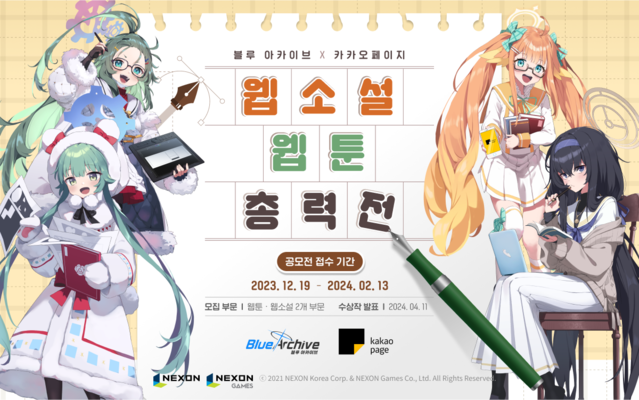 넥슨은 카카오엔터테인먼트와 손잡고 서브컬처 게임 ‘블루 아카이브’의 웹소설 및 웹툰 공모전을 개최한다고 23일 밝혔다.총 상금 1억원 규모의 ‘블루 아카이브 X 카카오페이지 웹소설·웹툰 총력전’은 ‘블루 아카이브’ 세계관을 활용한 2차 창작 웹소설 또는 웹툰을 대상으로 한다. 수상자에게는 500만 원의 상금과 함께 공모작이 카카오페이지에 정식으로 무료 연재되는 기회가 주어진다. 넥슨은 더 많은 이용자들이 수상작을 접할 수 있도록 향후 모든 수상작을 모은 작품집을 출간할 계획이다.공모전 접수는 12월 19일부터 2024년 2월 13일까지 진행된다. 웹소설 부문은 카카오페이지에서, 웹툰 부문은 ‘블루 아카이브’ 공식 커뮤니티에서 참가할 수 있다. 접수된 작품은 완성도, 독창성, 대중성 등을 기준으로 내부 심사를 거쳐 2024년 4월 11일에 총 20개의 수상작이 발표될 예정이다.넥슨게임즈 김용하 총괄 PD는 “이번 공모전을 통해 공식 세계관과는 또다른 매력을 지닌 독창적인 작품을 만나볼 수 있을 것으로 기대한다”고 소감을 밝혔다.