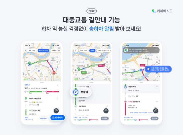 네이버는 이용자가 네이버 지도 앱을 통해 목적지까지 한층 편리하게 이동할 수 있도록 ‘대중교통 길안내’ 서비스를 출시했다고 11일 밝혔다.대중교통 길안내는 이용자의 현재 위치를 기반으로 목적지까지 이동하는 동안 필요한 정보를 안내해주는 서비스다. ▲버스를 타거나 지하철에서 내릴 때를 놓치지 않도록 돕는 ‘승하차 알림’ ▲이동 경로상 현재 위치를 한눈에 파악할 수 있는 ‘경로안내 바’ ▲하차까지 남은 정류장∙지하철역 개수 ▲빠른 환승을 위한 열차 출입문 위치 및 지하철역 출구 번호 등을 제공한다.네이버 지도는 이용자의 멀티태스킹을 지원하기 위해 다양한 편의 기능을 추가했다. 우선 ▲음성 안내 ▲팝업 등 다양한 방식으로 알림을 제공해 이용자가 독서를 하거나 영화를 보면서도 승하차 시점을 놓치지 않을 수 있게 지원한다. 지도 앱 화면에 ‘안내 중인 경로 바로가기’ 버튼도 추가했다. 이용자는 길안내를 받는 동시에 지도 앱에서 가볼 만한 곳을 탐색할 수 있고, 필요시 버튼을 눌러 빠르게 길안내 화면으로 전환할 수 있다.특히 네이버 지도의 대중교통 길안내 서비스는 스마트폰 OS의 제약 없이 누구나 이용할 수 있다는 점이 특징이다. iOS 이용자도 지하철이 포함된 경로에서 실시간 길안내를 받을 수 있도록 서비스를 구현했다.네이버 지도는 대중교통 길안내 서비스를 꾸준히 고도화하며 ▲장소 탐색 ▲길찾기∙이동 ▲방문 기록 등 이용자의 전반적인 여정을 지원하는 ‘올인원 플랫폼’으로서 입지를 공고히 한다고 밝혔다. 이용자의 실시간 위치와 버스∙지하철 도착 정보를 더 정확하게 매칭할 수 있도록 ‘실시간 위치 엔진’을 지속적으로 강화할 예정이다.