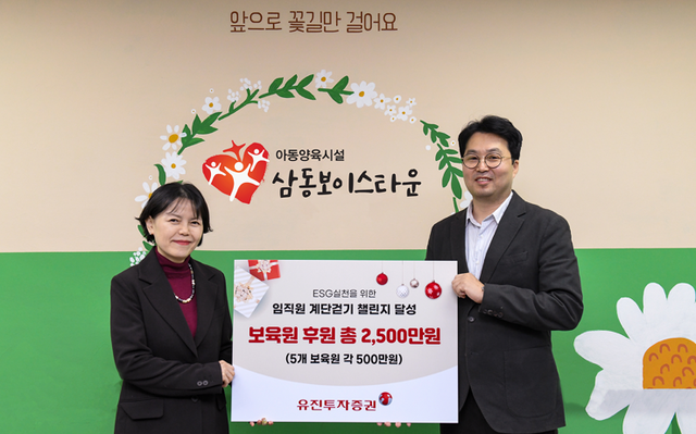 유진투자증권은 임직원들이 '다 함께 100층씩 계단 오르고 기부하기' 캠페인을 진행해 5개 보육원에 총 2500만원을 기부했다고 26일 밝혔다.이번 캠페인은 환경보호를 위한 탄소 배출 절감, 임직원들의 건강 증진, 사회 취약 계층 후원 세 가지 의미를 담고 있으며, 지난 10월 10일부터 11월 10일까지 임직원들이 평균 100층 이상 계단을 오르면 보육원에 후원금을 기부하는 방식으로 진행됐다.캠페인 결과, 500여명의 임직원들이 참여해 목표인 평균 100층 오르기를 초과하여 평균 149층 오르기를 달성했다. 총 7만5504층으로, 이를 통해 약 1.1톤의 탄소 배출량 저감에 기여했다.캠페인 성공에 따라 기존 후원 중이던 5개 보육원(▲남산원 ▲혜심원 ▲삼동보이스타운 ▲송죽원 ▲연두꿈터)에 운동화, 책가방 등 아동들에게 필요한 물품 구입 용도로 각 500만원씩, 총 2500만원의 후원금을 지난주 전달했다.회사는 해당 보육원들에 2017년부터 연간 약 8200만원 규모의 매칭펀드 후원을 진행하고 있다.이 회사는 2011년부터 ‘사회공헌’을 핵심 경영방침으로 정하고 ▲유진의 숲 조성 ▲홈리스 배식 ▲지역아동센터 배식 ▲ 장애직원 미술활동 지원 등 다양한 사회공헌 활동을 펼쳐왔다. 특히 2023년부터는 임직원들의 자율성을 보장하는 동시에 봉사활동의 기쁨을 느끼게 하기 위해 ‘자율선택형 봉사 프로그램’을 도입해 새로운 사회공헌 문화를 만들고 있다.회사 관계자는 “이번 계단 오르기 캠페인은 환경보호, 건강증진, 사회공헌이라는 세 가지 가치를 임직원들이 함께 실천하는 의미를 담아 진행한 사회공헌 프로그램”이라며 “앞으로도 다양한 사회공헌 활동을 통해 ESG 경영을 강화하고, 나눔의 가치를 실천해나가겠다”고 전했다.