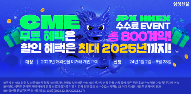 삼성선물은 신년맞이 해외선물 무료·할인 수수료 이벤트를 2일부터 시작한다고 밝혔다.이번 이벤트 대상은 CME(미국), HKEX(홍콩), JPX(일본) 거래소 상품으로, 이벤트 신청 시 4개월간 총 800계약의 무료 거래가 가능하고, 무료 수량 소진 시 할인 수수료가 적용된다. 할인 수수료는 신청월 및 이후 6개월 동안 적용되며, 할인 기간 내 1계약 이상 거래 시 3개월 단위 자동 연장, 최대 2025년 말까지 적용된다.CME 거래소 대표 품목은 개인 고객들에게 익숙한 나스닥·S&P 지수, 원유, 천연가스, 마이크로 나스닥 지수 등이 있다. 무료 수량은 일반·미니 품목 10계약씩, 마이크로 품목 100계약씩 총 4개월간 매월 제공된다. 할인 수수료는 편도 기준, 지수 1.95달러, 마이크로 지수 0.49달러, 지수 제외 일반 상품은 2.5달러, 마이크로 상품은 0.80달러다.HKEX 거래소 대표 품목은 항셍 지수와 미니 항셍 지수가 있으며, 최근 변동성이 높은 항셍 테크도 주목 받고 있다. 무료 수량은 일반 10계약, 미니 품목 35계약이고 4개월간 매월 제공된다. 할인 수수료는 일반·미니 모두 25HK달러이다.