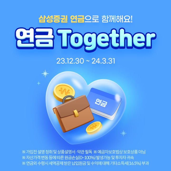 삼성증권은 '연금 투게더' 이벤트를 오는 3월 31일까지 진행한다고 8일 밝혔다해당 이벤트는 기간 내 연금계좌에 신규 입금, 퇴직금 입금, 타사연금 가져오기, 만기된 ISA 연금으로 입금의 경우를 모두 합산해 순입금액 구간에 따라 신세계 모바일상품권을 최대 73만원까지 지급한다.첫번째 이벤트로 연금저축 계좌에 1000만원 이상 3000만원 미만 입금하면 신세계 모바일상품권 1만원을 지급하고 단계적으로 최대 5억원 이상 입금하면 70만원을 지급한다.두번째 이벤트는 IRP 계좌에 1000만원 이상 3000만원 미만 입금하면 신세계 모바일상품권 1만원을 지급하고 3000만원 이상 입금하면 3만원을 지급한다.두 이벤트는 중복 지급이 가능하며, 지급조건 금액을 2배로 인정받는 방법(최대 2배까지 인정)은 55세 이상 고객님께서 순입금한 경우(계좌 주민번호 기준 출생연도 1970년까지 인정)이다.연금저축·IRP 계좌에 300만원 이상 1000만원 미만 입금하면 각각 선착순 3000명에게 스타벅스 아메리카노 1잔을 지급한다.이벤트와 관련한 자세한 내용은 삼성증권 홈페이지 또는 모바일앱 '엠팝(mPOP)'을 참고하면 된다.