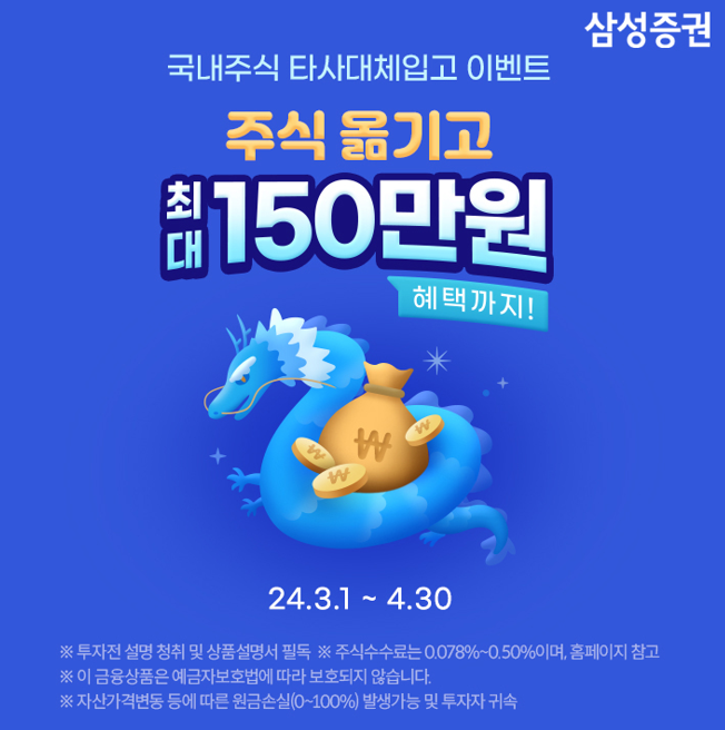 삼성증권은 타사 국내주식을 대체 순입고한 고객 대상으로 최대 150만원을 지급하는 이벤트를 4월말까지 진행한다고 4일 밝혔다.이벤트에 참여하려면 4가지 조건을 모두 충족하면 된다.이벤트 기간이 시행되는 4월말까지 이벤트를 신청하고, 최소 1000만 원 이상(입고 전일의 평가액 기준)의 주식을 타사에서 삼성증권으로 대체입고하고, 주식을 입고한 비대면계좌에서 온라인 국내주식 1000만 원 이상 매매한 후 마지막으로 2024년 5월 31일까지 삼성증권 총잔고를 유지할 경우 최대 150만 원 리워드를 지급한다.리워드는 크게 3가지다. 우선 순입고금액에 따른 혜택으로, 최소 1000만 원 이상 국내주식 입고, 입고한 비대면계좌에서 1000만 원 이상 온라인 매매하면 최소 5000원부터 거래금액에 따라 최대 100만 원까지 리워드를 지급한다.또한 10억 원 이상 입고 및 거래한 경우 고객이 입고한 비대면계좌에서 5억 원이상 온라인매매를 하면 최소 5만 원부터 최대 20만 원까지 슈퍼리워드를 지급한다.1000만 원 이상 입고하고 총 자산 30억 원 이상이 되는 경우 지난 2월 29일 기준 총자산 30억 원 미만 고객이 이벤트 기간 내 1000만 원 이상 순입고해 올해 5월 31일기준의 총 잔고가 30억 원 이상인 경우 30만 원의 프리미엄 리워드를 지급한다.삼성증권은 해외주식 대체입고 이벤트도 4월 말까지 진행 중이다. 타사 해외주식을 삼성증권으로 대체 순입고한 고객 대상으로 최대 400만 원을 지급한다.이 회사는 미국주식의 온라인 거래수수료 혜택을 제공하는 '해외주식 수수료 혜택맛집' 이벤트도 6월말까지 실시하고 있다.2023년 8월 1일부터 2024년 1월 31일까지 삼성증권에서 해외주식 거래가 없는 고객이 신청 시 3개월간 미국주식 온라인 거래수수료 0원, 이후 평생 온라인 거래수수료 0.03% 적용된다.