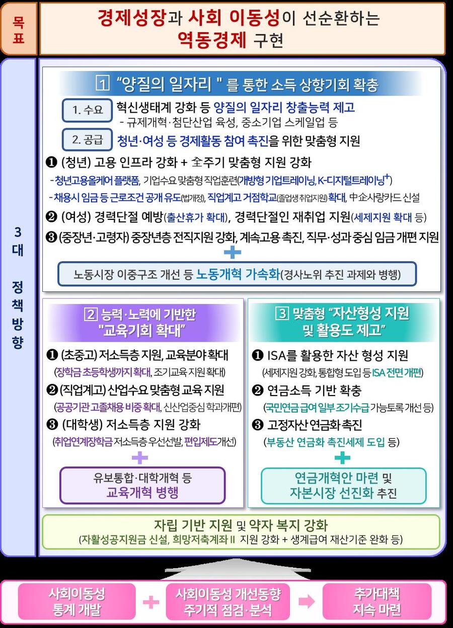 ◇ISA 통합, 손익통산 확대 … 국민연금 조기 지급정부는 ISA 제도도 전면 개편하기로 했다. 유형별로 구분된 ISA 통합 또는 1인 1계좌 원칙 폐지 등 종합적인 개선방안을 검토하고 손익통산 확대를 추진한다.또 공시범위 확대, 편입상품 다양화, 이전방식 개선을 검토하는 'ISA 경쟁촉진 3종세트'를 통한 투자자의 선택권 제고도 추진한다.국민연금 급여의 '일부'도 조기 수령할 수 있도록 제도 개선을 검토한다. 현재는 '급여 전액'에 대해서만 최대 5년, 1년당 6%씩 감액 기준으로 앞당겨 받을 수 있다.1주택 이하 기초연금 수급자가 장기보유 부동산을 매각해 연금 계좌에 납입할 때는 양도소득세를 경감하는 '부동산 연금화 촉진 세제'도 도입하기로 했다.고령층 가계자산의 80% 이상을 차지하는 부동산의 유동화를 촉진하고 가계소득과 현금흐름을 개선하기 위한 연구용역도 추진할 계획이다.아울러 생계급여 수급자가 자활근로를 통해 탈수급할 경우 '자활성공지원금'을 지급하고 자산 형성 지원도 강화한다. 자활성공지원금은 탈수급 후 취업지속 시 연간 최대 150만원을 지원하는 제도다.최상목 부총리 겸 기재부 장관은 “이번 대책은 사회이동성 개선을 위한 첫 번째 대책으로, 향후 추가과제를 발굴해 역동경제 로드맵에 종합 반영하고, 의견수렴을 거쳐 하반기 중 후속대책을 마련하겠다”고 말했다.이에 따라 정부는 연내 1000만명 이상을 표본으로 하는 사회이동성 통계를 개발하고, 올 하반기 중 의견수렴을 통해 2차 사회이동성 개선방안을 마련할 계획이다.