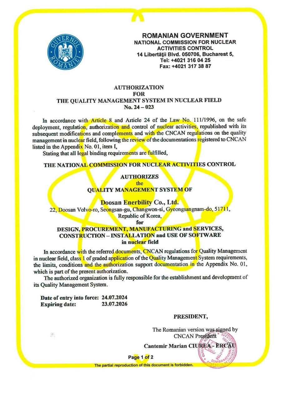 두산에너빌리티가 루마니아 대형 원전과 SMR 사업 참여에 속도를 내고 있다.두산에너빌리티는 루마니아 원자력규제기관(CNCAN)으로부터 루마니아의 대형 원전과 SMR(소형모듈원자로)의 기자재 설계, 제작, 구매, 시공 및 서비스를 위한 인증을 취득했다고 31일 밝혔다.이를 통해 두산에너빌리티는 루마니아 체르나보다 원전 1호기의 설비개선사업에 본격적으로 참여할 예정이다. 두산에너빌리티는 지난 5월 이 원전의 피더관(Feeder Pipe) 제작 공급 계약을 체결한 바 있다. 피더관은 가압중수로형체르나보다 원전 1호기는 오는 2026년 운전허가일이 만료될 예정으로, 30년 추가 운전을 위한 설비개선사업이 진행 중이다. 한국수력원자력을 비롯한 캔두 에너지, 이탈리아 안살도 뉴클리어 컨소시엄은 이 원전의 설비개선사업 3단계 수주를 추진하고 있다.두산에너빌리티는 뉴스케일파워(NuScale Power)가 주도하는 루마니아 SMR 사업에도 참여할 예정이다. 발주처인 루마니아 로파워(RoPower)는 도이세슈티(Doicesti) 지역 석탄화력발전소 부지에 총 462MW 규모의 SMR 발전소 건설을 추진하고 있으며, 지난 24일 플루오르(Fluor) 등과 기본설계(FEED) 계약을 체결한 바 있다.지난 4월에는 클라우스 요하니스 루마니아 대통령이 두산에너빌리티의 SMR, 대형 원전 주기기 제작 역량을 확인하기 위해 경남 창원 두산에너빌리티 본사를 방문했다. 두산에너빌리티는 2019년부터 국내 투자사들과 함께 뉴스케일파워에 지분투자를 하며 핵심 기자재 공급권을 확보했으며, 2021년 뉴스케일파워 SMR 제작성 검토를 완료하는 등 기자재 제작 준비를 마쳤다.김종두 두산에너빌리티 원자력BG장은 “이번 인증 취득으로 루마니아 원전 설비개선사업과 SMR 사업에 본격적으로 참여할 예정”이라며 “앞으로도 지속적인 품질 활동을 통해 K-원전 제작 역량 신뢰도 제고에 최선을 다할 것”이라고 말했다.