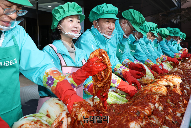 하나금융지주 임직원들이 11일 오전 서울 중구 하나금융그룹 명동사옥에서 열린 '2024 모두하나데이 사랑의 김장 나눔' 행사에서 김장을 하고 있다.