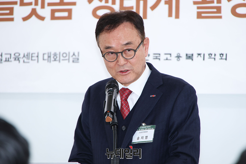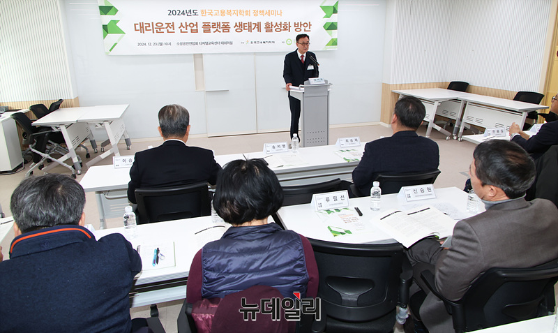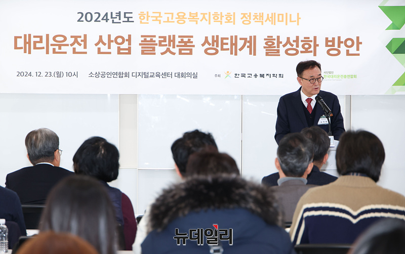 송치영 소상공인연합회장이 23일 오전 서울 마포구 소상공인연합회 디지털교육센터에서 열린 '대리운전 산업 플랫폼 생태계 활성화 방안 세미나'에서 축사를 하고 있다.