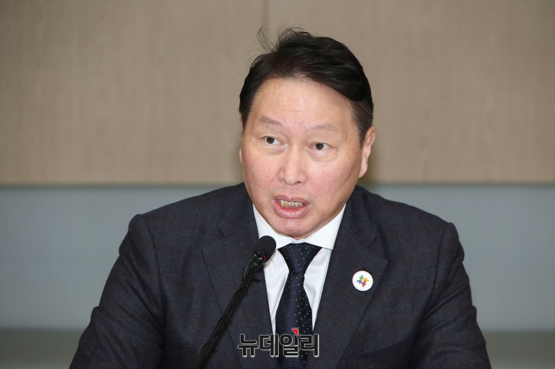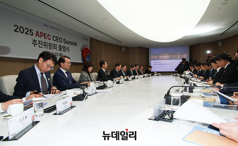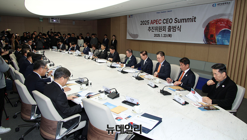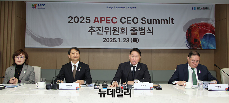 2025 아시아태평양경제협력체(APEC) CEO 서밋 의장인 최태원 대한상공회의소 회장이 23일 오전 서울 중구 대한상공회의소 EC룸에서 열린 2025 APEC CEO 서밋 추진위원회 출범식에서 발언하고 있다.