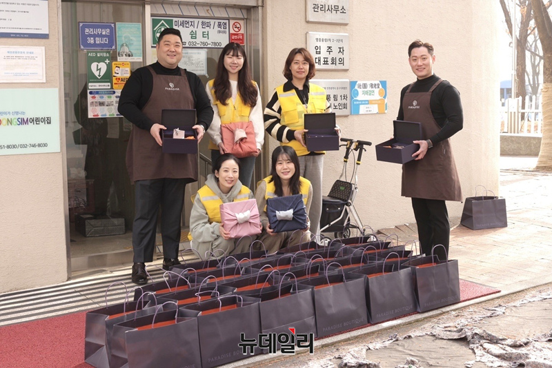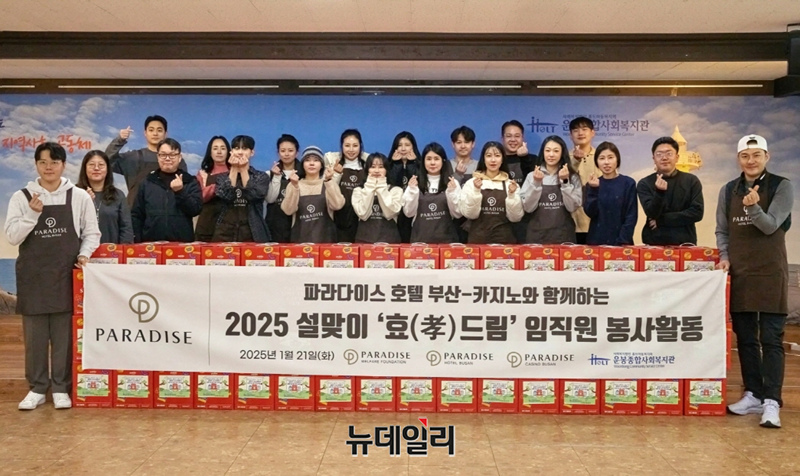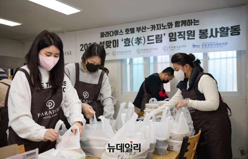 파라다이스 임직원들이 21일 부산 해운대구 운봉종합사회복지관에서 '효(孝)드림' 봉사활동에 참여해 기념 촬영을 하고 있다.'효(孝)드림'은 지역사회 상생을 위해 올해로 12년째 이어오고 있는 파라다이스의 대표적인 사회공헌활동이다.파라다이스 임직원들로 구성된 '효(孝)드림' 봉사단은 21일 부산 해운대구 주민들을 위해 떡국 특식 총 350인분을 지원하고 22일에는 인천 영종도 어르신 30여 명에게 설 선물세트를 전달했다. 23일 서울 중구 지역에서도 나눔 행사를 실시할 예정이다. (사진=파라다이스)