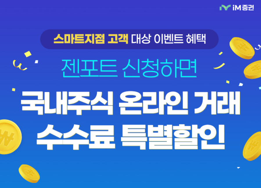 iM증권은 내년 1월 25일까지 비대면 스마트지점 젠포트 서비스 등록 고객을 대상으로 수수료 혜택 이벤트를 진행한다.젠포트는 온라인 자산관리 핀테크 기업인 ㈜뉴지스탁에서 제공하는 주식매매 포트폴리오 제작 서비스로, 투자자가 맞춤형 포트폴리오를 제작해 매매에 활용할 수 있도록 지원한다.투자자는 펀더멘탈 등 600여 개의 요소를 활용해 본인만의 포트폴리오를 구성할 수 있으며, 최대 10개의 계좌를 등록해 각기 다른 10개의 포트폴리오를 제작 및 활용해 볼 수 있다.iM증권은 비대면 스마트지점 고객이 젠포트를 통해 포트폴리오 구성 후 국내 주식 거래를 진행하는 경우 0.0125%의 수수료를 적용한다.이와 더불어 MTS ‘iM 하이’ 등 온라인 매체를 통해 국내 주식을 직접 거래하는 경우 최초 첫 번째 등록 계좌는 0.01%, 이후 등록된 계좌는 0.0125%로 수수료를 특별 우대해 제공한다.특별 우대 수수료 혜택은 직전 3개월 내 젠포트를 활용해 포트폴리오 구성 및 주식매매가 진행되면 지속해서 적용한다.